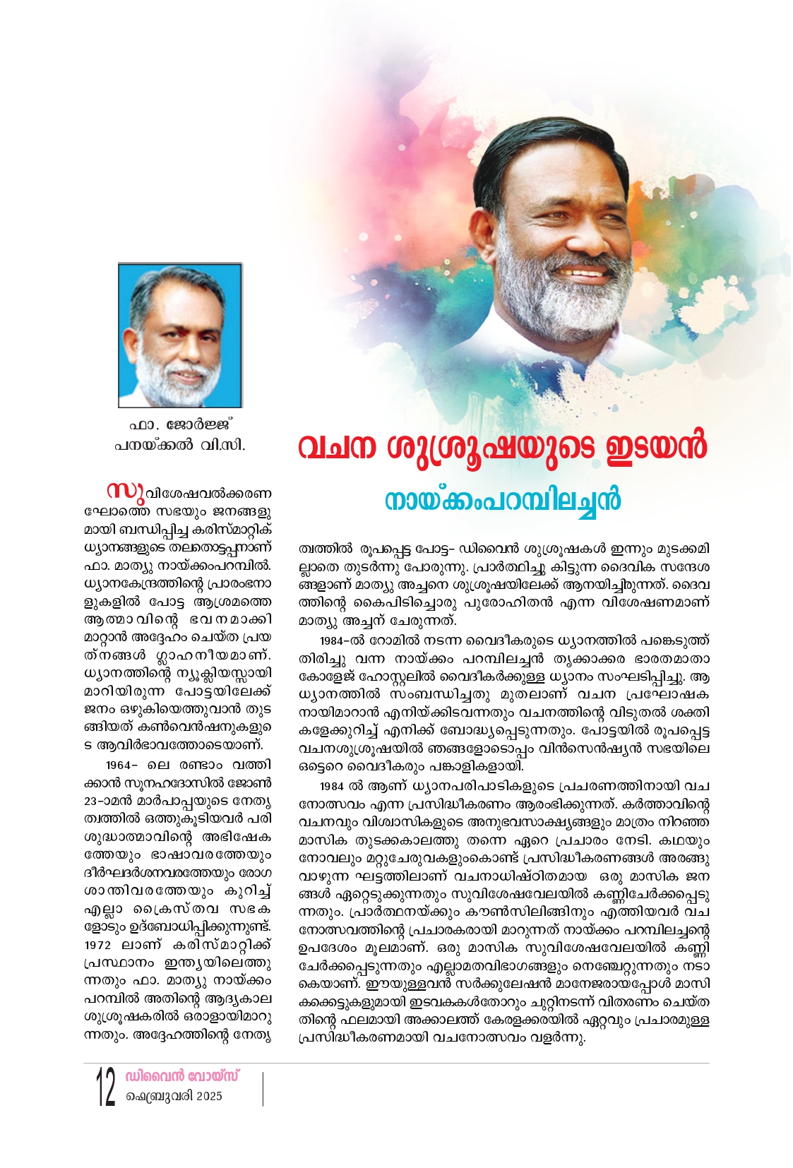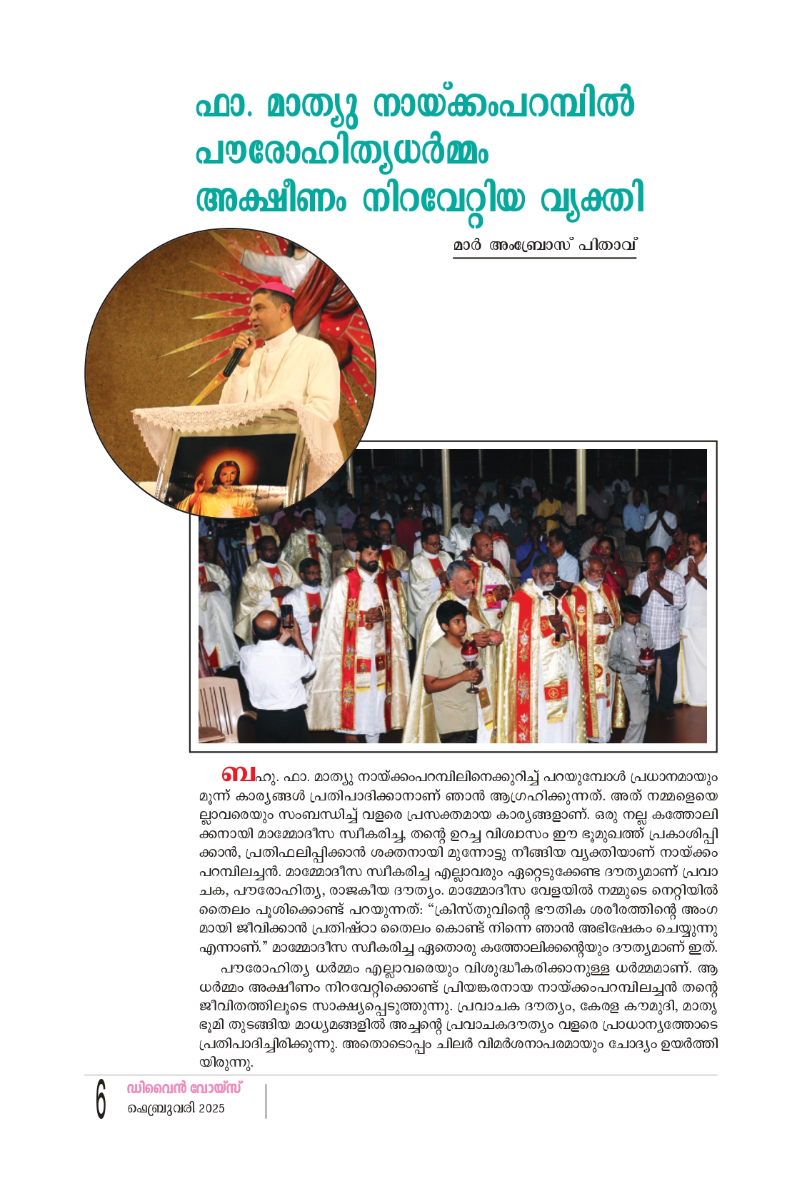ബഹു. ഫാ. മാത്യു നായ്ക്കംപറമ്പിലിനെക്കുറിച്ച് പറയുമ്പോൾ പ്രധാനമായും മൂന്ന് കാര്യങ്ങൾ പ്രതിപാദിക്കാനാണ് ഞാൻ ആഗ്രഹിക്കുന്നത്. അത് നമ്മളെയെ ല്ലാവരെയും സംബന്ധിച്ച് വളരെ പ്രസക്തമായ കാര്യങ്ങളാണ്. ഒരു നല്ല കത്തോലി ക്കനായി മാമ്മോദീസ സ്വീകരിച്ച, തൻ്റെ ഉറച്ച വിശ്വാസം ഈ ഭൂമുഖത്ത് പ്രകാശിപ്പി ക്കാൻ, പ്രതിഫലിപ്പിക്കാൻ ശക്തനായി മുന്നോട്ടു നീങ്ങിയ വ്യക്തിയാണ് നായ്ക്കം പറമ്പിലച്ചൻ, മാമ്മോദീസ സ്വീകരിച്ച എല്ലാവരും ഏറ്റെടുക്കേണ്ട ദൗത്യമാണ് പ്രവാ ചക, പൗരോഹിത്യ, രാജകീയ ദൗത്യം. മാമ്മോദീസ വേളയിൽ നമ്മുടെ നെറ്റിയിൽ തൈലം പൂശിക്കൊണ്ട് പറയുന്നത്: "ക്രിസ്തുവിൻ്റെ ഭൗതിക ശരീരത്തിന്റെ അംഗ മായി ജീവിക്കാൻ പ്രതിഷ്ഠാ തൈലം കൊണ്ട് നിന്നെ ഞാൻ അഭിഷേകം ചെയ്യുന്നു എന്നാണ്.” മാമ്മോദീസ സ്വീകരിച്ച ഏതൊരു കത്തോലിക്കന്റെയും ദൗത്യമാണ് ഇത്. പൗരോഹിത്യ ധർമ്മം എല്ലാവരെയും വിശുദ്ധീകരിക്കാനുള്ള ധർമ്മമാണ്. ആ ധർമ്മം അക്ഷീണം നിറവേറ്റിക്കൊണ്ട് പ്രിയങ്കരനായ നായ്ക്കംപറമ്പിലച്ചൻ തന്റെ ജീവിതത്തിലൂടെ സാക്ഷ്യപ്പെടുത്തുന്നു. പ്രവാചക ദൗത്യം, കേരള കൗമുദി, മാത്യ ഭൂമി തുടങ്ങിയ മാധ്യമങ്ങളിൽ അച്ചൻ്റെ പ്രവാചകദൗത്യം വളരെ പ്രാധാന്യത്തോടെ പ്രതിപാദിച്ചിരിക്കുന്നു. അതൊടൊപ്പം ചിലർ വിമർശനാപരമായും ചോദ്യം ഉയർത്തി