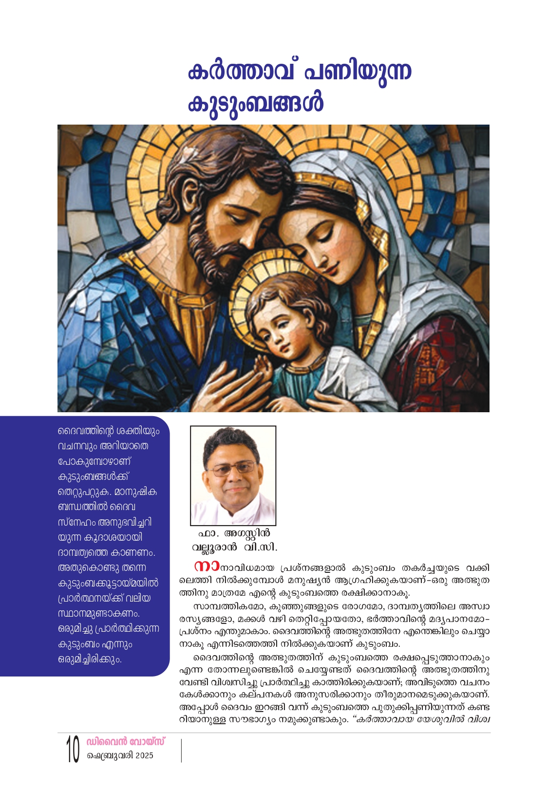ലെത്തി നിൽക്കുമ്പോൾ മനുഷ്യൻ ആഗ്രഹിക്കുകയാണ് ഒരു അത്ഭുത ത്തിനു മാത്രമേ എൻ്റെ കുടുംബത്തെ രക്ഷിക്കാനാകു. സാമ്പത്തികമോ, കുഞ്ഞുങ്ങളുടെ രോഗമോ, ദാമ്പത്യത്തിലെ അസ്വാ രസ്യങ്ങളോ, മക്കൾ വഴി തെറ്റിപ്പോയതോ, ഭർത്താവിന്റെ മദ്യപാനമോ-പ്രശ്നം എന്തുമാകാം. ദൈവത്തിൻ്റെ അത്ഭുതത്തിനേ എന്തെങ്കിലും ചെയ്യാ നാകു എന്നിടത്തെത്തി നിൽക്കുകയാണ് കുടുംബം. ദൈവത്തിന്റെ അത്ഭുതത്തിന് കുടുംബത്തെ രക്ഷപ്പെടുത്താനാകും എന്ന തോന്നലുണ്ടെങ്കിൽ ചെയ്യേണ്ടത് ദൈവത്തിന്റെ അത്ഭുതത്തിനു വേണ്ടി വിശ്വസിച്ചു പ്രാർത്ഥിച്ചു കാത്തിരിക്കുകയാണ്, അവിടുത്തെ വചനം കേൾക്കാനും കല്പനകൾ അനുസരിക്കാനും തീരുമാനമെടുക്കുകയാണ്. അപ്പോൾ ദൈവം ഇറങ്ങി വന്ന് കുടുംബത്തെ പുതുക്കിപ്പണിയുന്നത് കണ്ട റിയാനുള്ള സൗഭാഗ്യം നമുക്കുണ്ടാകും. “കർത്താവായ യേശുവിൽ വിശ്വ