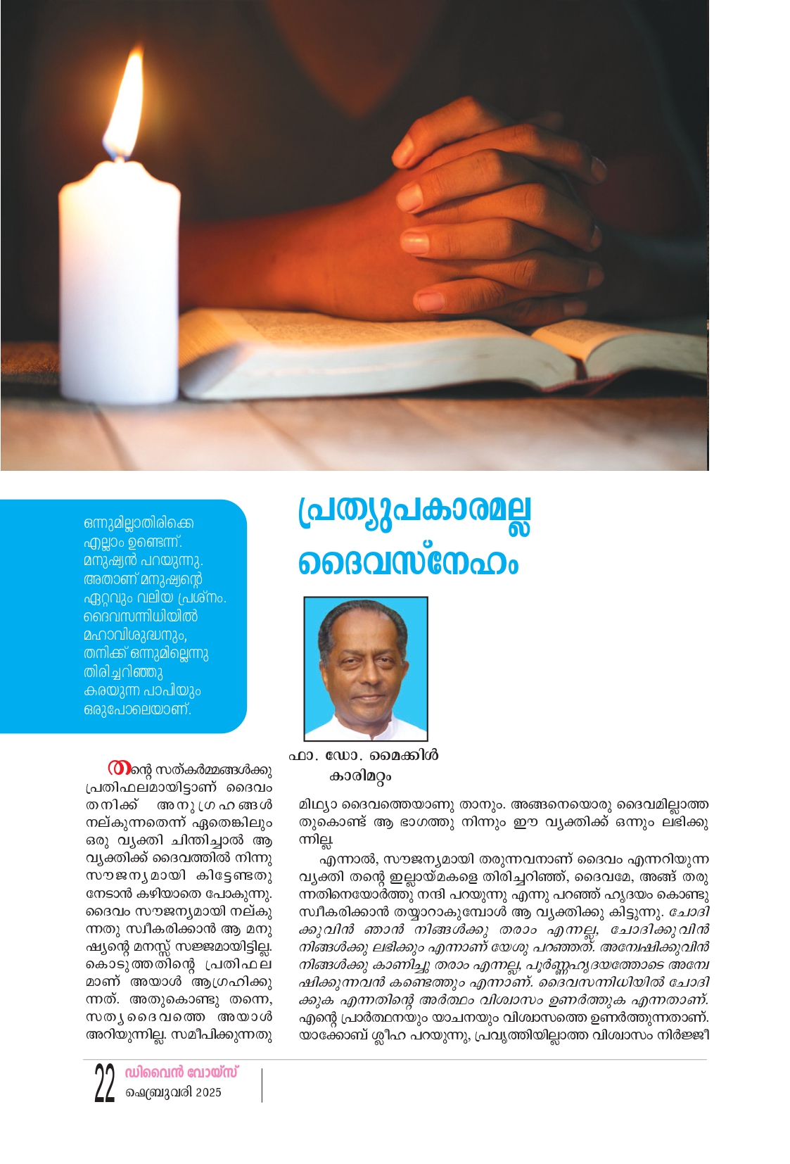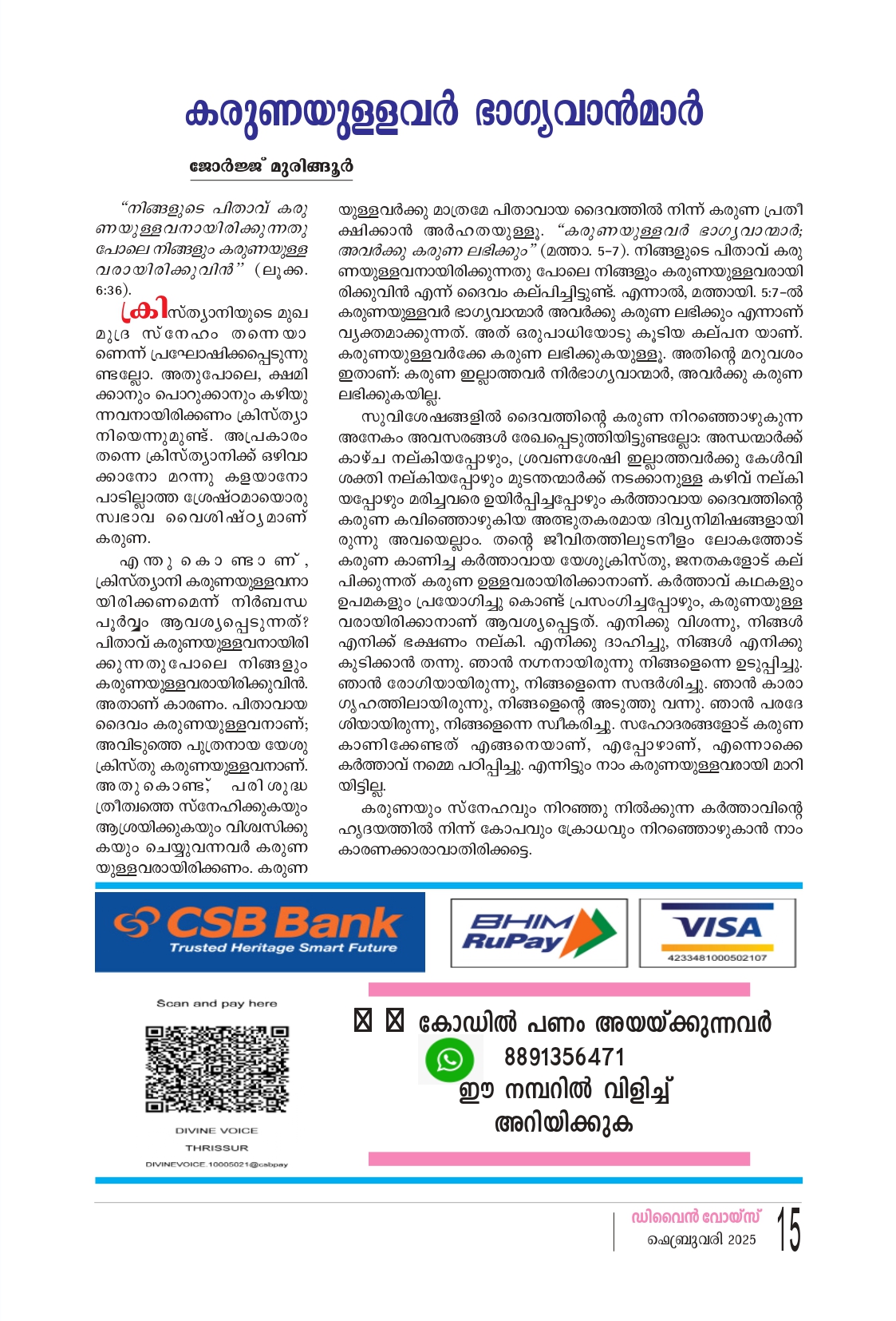 ക്രിസ്ത്യാനിയുടെ മുഖ മുദ്ര സ്നേഹം തന്നെയാ ണെന്ന് പ്രഘോഷിക്കപ്പെടുന്നു ണ്ടല്ലോ. അതുപോലെ, ക്ഷമി ക്കാനും പൊറുക്കാനും കഴിയു ന്നവനായിരിക്കണം ക്രിസ്ത്യാ നിയെന്നുമുണ്ട്. അപ്രകാരം തന്നെ ക്രിസ്ത്യാനിക്ക് ഒഴിവാ ക്കാനോ മറന്നു കളയാനോ പാടില്ലാത്ത ശ്രേഷ്ഠമായൊരു സ്വഭാവ വൈശിഷ്ഠ്യമാണ് കരുണ. ക്രിസ്ത്യാനി കരുണയുള്ളവനാ യിരിക്കണമെന്ന് നിർബന്ധ പൂർവ്വം ആവശ്യപ്പെടുന്നത്? പിതാവ് കരുണയുള്ളവനായിരി ക്കുന്നതുപോലെ നിങ്ങളും കരുണയുള്ളവരായിരിക്കുവിൻ. അതാണ് കാരണം പിതാവായ ദൈവം കരുണയുള്ളവനാണ്; അവിടുത്തെ പുത്രനായ യേശു ക്രിസ്തു കരുണയുള്ളവനാണ്. അതുകൊണ്ട്, പരിശുദ്ധ ത്രീത്വത്തെ സ്നേഹിക്കുകയും ആശ്രയിക്കുകയും വിശ്വസിക്കു കയും ചെയ്യുവന്നവർ കരുണ യുള്ളവരായിരിക്കണം. കരുണ യുള്ളവർക്കു മാത്രമേ പിതാവായ ദൈവത്തിൽ നിന്ന് കരുണ പ്രതീ ക്ഷിക്കാൻ അർഹതയുള്ളൂ. “കരുണയുള്ളവർ ഭാഗ്യവാന്മാർ; അവർക്കു കരുണ ലഭിക്കും" (മത്താ. 5-7). നിങ്ങളുടെ പിതാവ് കരു ണയുള്ളവനായിരിക്കുന്നതു പോലെ നിങ്ങളും കരുണയുള്ളവരായി രിക്കുവിൻ എന്ന് ദൈവം കല്പിച്ചിട്ടുണ്ട്. എന്നാൽ, മത്തായി. 5:7-ൽ കരുണയുള്ളവർ ഭാഗ്യവാന്മാർ അവർക്കു കരുണ ലഭിക്കും എന്നാണ് വ്യക്തമാക്കുന്നത്. അത് ഒരുപാധിയോടു കൂടിയ കല്പന യാണ്. കരുണയുള്ളവർക്കേ കരുണ ലഭിക്കുകയുള്ളൂ. അതിൻ്റെ മറുവശം ഇതാണ്: കരുണ ഇല്ലാത്തവർ നിർഭാഗ്യവാന്മാർ, അവർക്കു കരുണ ലഭിക്കുകയില്ല