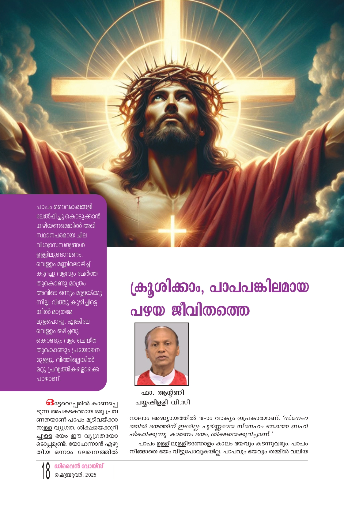 സന്തോഷവും ദുഃഖവും ഇടകലർന്നതാണ് ഈ ജീവിതം. ജീവിത ത്തിന്റെ വഴികാട്ടിയാണ് വചനഗ്രന്ഥം. അതിൽ സന്തോഷവും പ്രകാ ലും ദുഃഖവും മഹിമയും ഉണ്ട്. ഒരിക്കൽ ബൈബിൾ തുറന്നപ്പോൾ ശവും കിട്ടിയ ഭാഗം ഇതാണ്. “പിലാത്തോസ് അവരോടു ചോദിച്ചു. നിങ്ങളുടെ രാജാവിനെ ഞാൻ ക്രൂശിക്കണമെന്നോ? പുരോഹിതപ്രമുഖന്മാർ പറഞ്ഞു: സീസർ അല്ലാതെ ഞങ്ങൾക്കു വേറെ രാജാവില്ല. അപ്പോൾ അവൻ യേശുവിനെ ക്രൂശിക്കാനായി വിട്ടു." (യോഹ. 19:15-16).