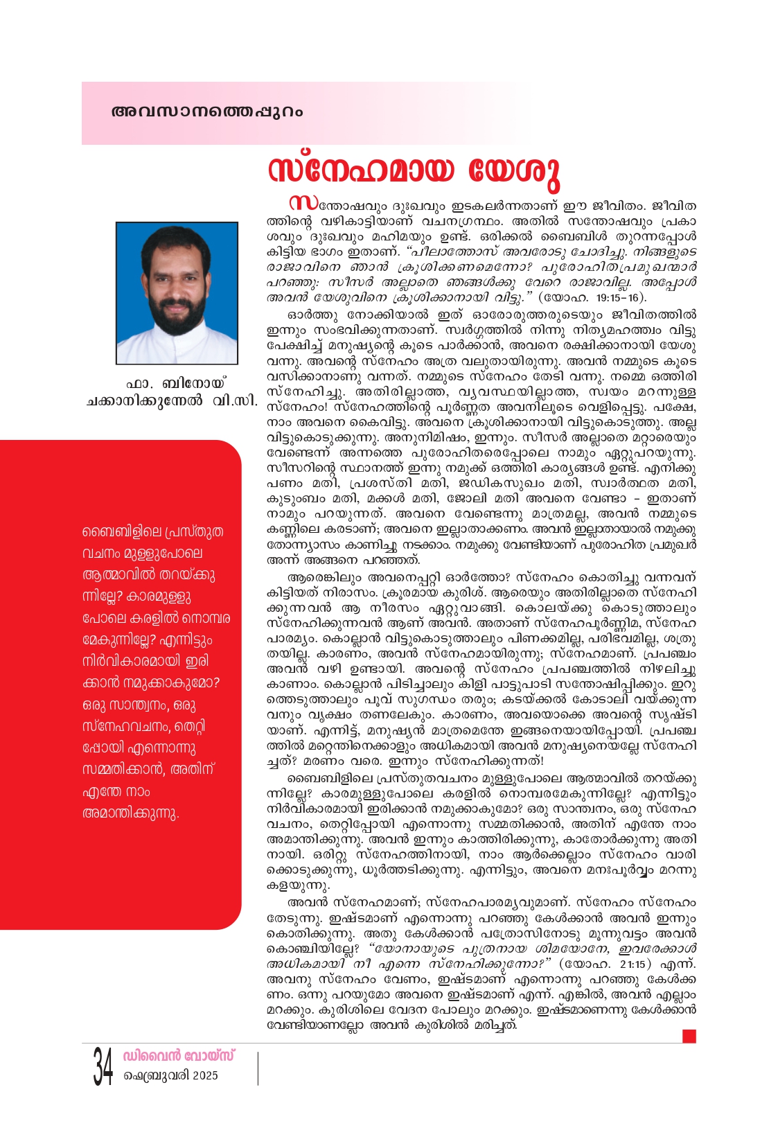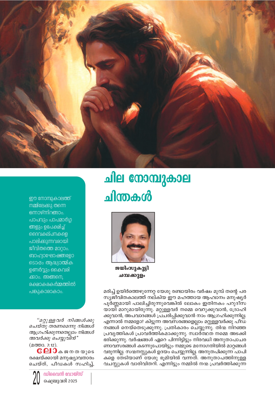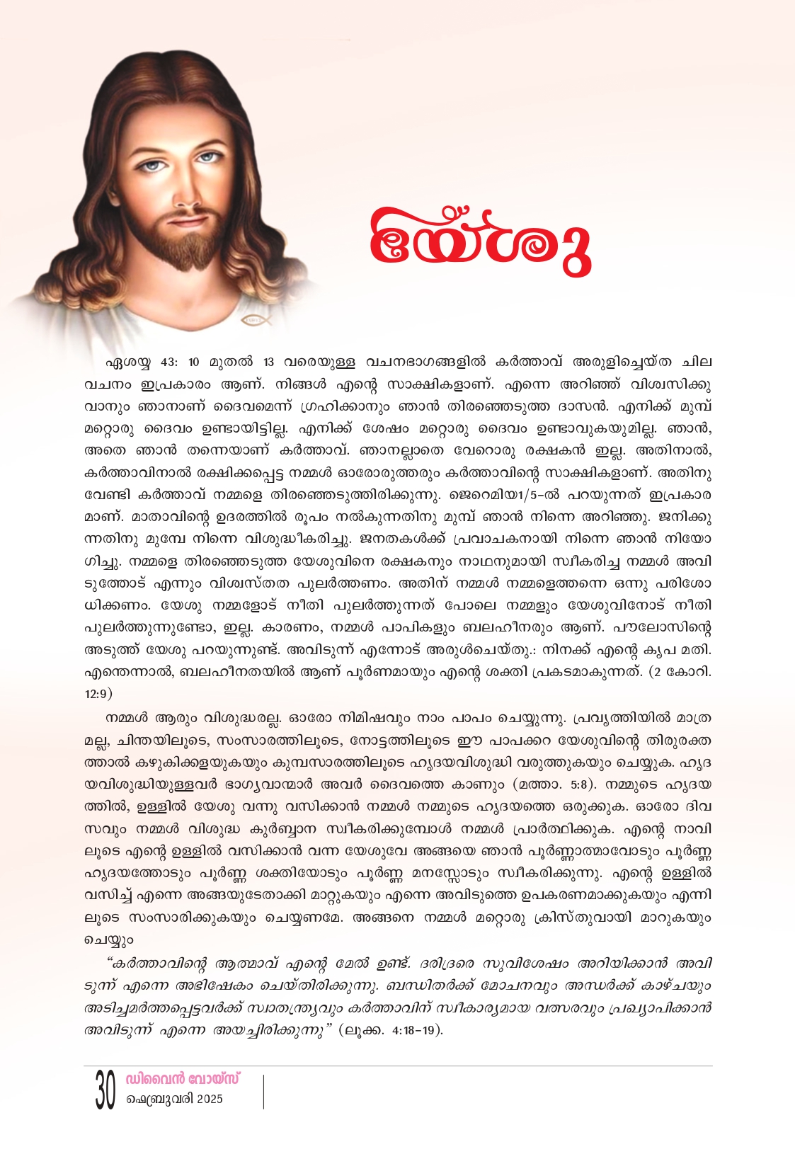 ഏശയ്യ 43: 10 മുതൽ 13 വരെയുള്ള വചനഭാഗങ്ങളിൽ കർത്താവ് അരുളിച്ചെയ്ത ചില വചനം ഇപ്രകാരം ആണ്. നിങ്ങൾ എൻ്റെ സാക്ഷികളാണ്. എന്നെ അറിഞ്ഞ് വിശ്വസിക്കു വാനും ഞാനാണ് ദൈവമെന്ന് ഗ്രഹിക്കാനും ഞാൻ തിരഞ്ഞെടുത്ത ദാസൻ. എനിക്ക് മുമ്പ് മറ്റൊരു ദൈവം ഉണ്ടായിട്ടില്ല. എനിക്ക് ശേഷം മറ്റൊരു ദൈവം ഉണ്ടാവുകയുമില്ല. ഞാൻ, അതെ ഞാൻ തന്നെയാണ് കർത്താവ്, ഞാനല്ലാതെ വേറൊരു രക്ഷകൻ ഇല്ല. അതിനാൽ, കർത്താവിനാൽ രക്ഷിക്കപ്പെട്ട നമ്മൾ ഓരോരുത്തരും കർത്താവിൻ്റെ സാക്ഷികളാണ്. അതിനു വേണ്ടി കർത്താവ് നമ്മളെ തിരഞ്ഞെടുത്തിരിക്കുന്നു. ജെറെമിയ1/5-ൽ പറയുന്നത് ഇപ്രകാര മാണ്. മാതാവിൻ്റെ ഉദരത്തിൽ രൂപം നൽകുന്നതിനു മുമ്പ് ഞാൻ നിന്നെ അറിഞ്ഞു. ജനിക്കു ന്നതിനു മുമ്പേ നിന്നെ വിശുദ്ധീകരിച്ചു. ജനതകൾക്ക് പ്രവാചകനായി നിന്നെ ഞാൻ നിയോ ഗിച്ചു. നമ്മളെ തിരഞ്ഞെടുത്ത യേശുവിനെ രക്ഷകനും നാഥനുമായി സ്വീകരിച്ച നമ്മൾ അവി ടുത്തോട് എന്നും വിശ്വസ്തത പുലർത്തണം. അതിന് നമ്മൾ നമ്മളെത്തന്നെ ഒന്നു പരിശോ ധിക്കണം. യേശു നമ്മളോട് നീതി പുലർത്തുന്നത് പോലെ നമ്മളും യേശുവിനോട് നീതി പുലർത്തുന്നുണ്ടോ, ഇല്ല. കാരണം, നമ്മൾ പാപികളും ബലഹീനരും ആണ്. പൗലോസിന്റെ അടുത്ത് യേശു പറയുന്നുണ്ട്. അവിടുന്ന് എന്നോട് അരുൾചെയ്തു.: നിനക്ക് എന്റെ കൃപ മതി. എന്തെന്നാൽ, ബലഹീനതയിൽ ആണ് പൂർണമായും എൻ്റെ ശക്തി പ്രകടമാകുന്നത്. (2 കോറി. 12:9)