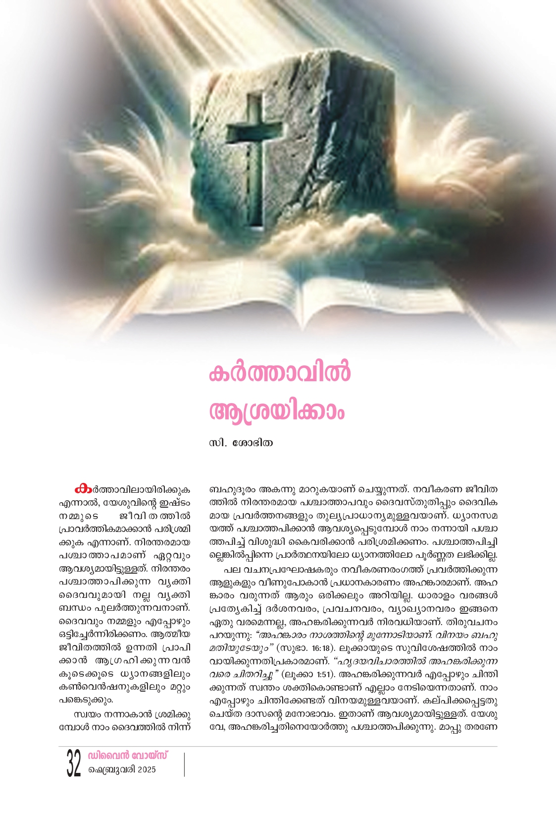 കാർത്താവിലായിരിക്കുക എന്നാൽ, യേശുവിന്റെ ഇഷ്ടം നമ്മുടെ ജീവിതത്തിൽ പ്രാവർത്തികമാക്കാൻ പരിശ്രമി ക്കുക എന്നാണ്. നിരന്തരമായ പശ്ചാത്താപമാണ് ഏറ്റവും ആവശ്യമായിട്ടുള്ളത്. നിരന്തരം പശ്ചാത്താപിക്കുന്ന വ്യക്തി ദൈവവുമായി നല്ല വ്യക്തി ബന്ധം പുലർത്തുന്നവനാണ്. ദൈവവും നമ്മളും എപ്പോഴും ഒട്ടിച്ചേർന്നിരിക്കണം. ആത്മീയ ജീവിതത്തിൽ ഉന്നതി പ്രാപി ക്കാൻ ആഗ്രഹിക്കുന്നവൻ കൂടെക്കൂടെ ധ്യാനങ്ങളിലും കൺവെൻഷനുകളിലും മറ്റും പങ്കെടുക്കും സ്വയം നന്നാകാൻ ശ്രമിക്കു മ്പോൾ നാം ദൈവത്തിൽ നിന്ന് ബഹുദൂരം അകന്നു മാറുകയാണ് ചെയ്യുന്നത്. നവീകരണ ജീവിത ത്തിൽ നിരന്തരമായ പശ്ചാത്താപവും ദൈവസ്തുതിപ്പും ദൈവിക മായ പ്രവർത്തനങ്ങളും തുല്യപ്രാധാന്യമുള്ളവയാണ്. ധ്യാനസമ യത്ത് പശ്ചാത്തപിക്കാൻ ആവശ്യപ്പെടുമ്പോൾ നാം നന്നായി പശ്ചാ ത്തപിച്ച് വിശുദ്ധി കൈവരിക്കാൻ പരിശ്രമിക്കണം. പശ്ചാത്തപിച്ചി ല്ലെങ്കിൽപ്പിന്നെ പ്രാർത്ഥനയിലോ ധ്യാനത്തിലോ പൂർണ്ണത ലഭിക്കില്ല. പല വചനപ്രഘോഷകരും നവീകരണരംഗത്ത് പ്രവർത്തിക്കുന്ന ആളുകളും വീണുപോകാൻ പ്രധാനകാരണം അഹങ്കാരമാണ്. അഹ ങ്കാരം വരുന്നത് ആരും ഒരിക്കലും അറിയില്ല. ധാരാളം വരങ്ങൾ പ്രത്യേകിച്ച് ദർശനവരം, പ്രവചനവരം, വ്യാഖ്യാനവരം ഇങ്ങനെ ഏതു വരമെന്നല്ല, അഹങ്കരിക്കുന്നവർ നിരവധിയാണ്. തിരുവചനം പറയുന്നു: “അഹങ്കാരം നാശത്തിൻ്റെ മുന്നോടിയാണ്. വിനയം ബഹു മതിയുടേയും" (സുഭാ. 16:18), ലൂക്കായുടെ സുവിശേഷത്തിൽ നാം വായിക്കുന്നതിപ്രകാരമാണ്. “ഹൃദയവിചാരത്തിൽ അഹങ്കരിക്കുന്ന വരെ ചിതറിച്ചു” (ലൂക്കാ 1:51). അഹങ്കരിക്കുന്നവർ എപ്പോഴും ചിന്തി ക്കുന്നത് സ്വന്തം ശക്തികൊണ്ടാണ് എല്ലാം നേടിയെന്നതാണ്. നാം എപ്പോഴും ചിന്തിക്കേണ്ടത് വിനയമുള്ളവയാണ്. കല്പിക്കപ്പെട്ടതു ചെയ്ത ദാസന്റെ മനോഭാവം. ഇതാണ് ആവശ്യമായിട്ടുള്ളത്. യേശു വേ, അഹങ്കരിച്ചതിനെയോർത്തു പശ്ചാത്തപിക്കുന്നു.
