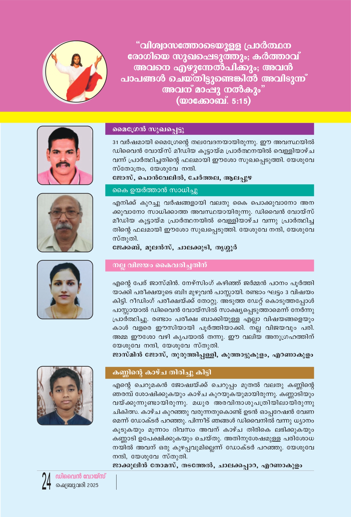 മൈഗ്രേൻ സുഖപ്പെട്ടു 31 വർഷമായി മൈഗ്രേൻ്റെ തലവേദനയായിരുന്നു. ഈ അവസ്ഥയിൽ ഡിവൈൻ വോയ്സ് മീഡിയ കൂട്ടായ്മ പ്രാർത്ഥനയിൽ വെള്ളിയാഴ്ച്ച വന്ന് പ്രാർത്ഥിച്ചതിൻ്റെ ഫലമായി ഈശോ സുഖപ്പെടുത്തി. യേശുവേ സ്തോത്രം, യേശുവേ നന്ദി. ജോസ്, പൊൻവേലിൽ, ചേർത്തല, ആലപ്പുഴ കൈ ഉയർത്താൻ സാധിച്ചു