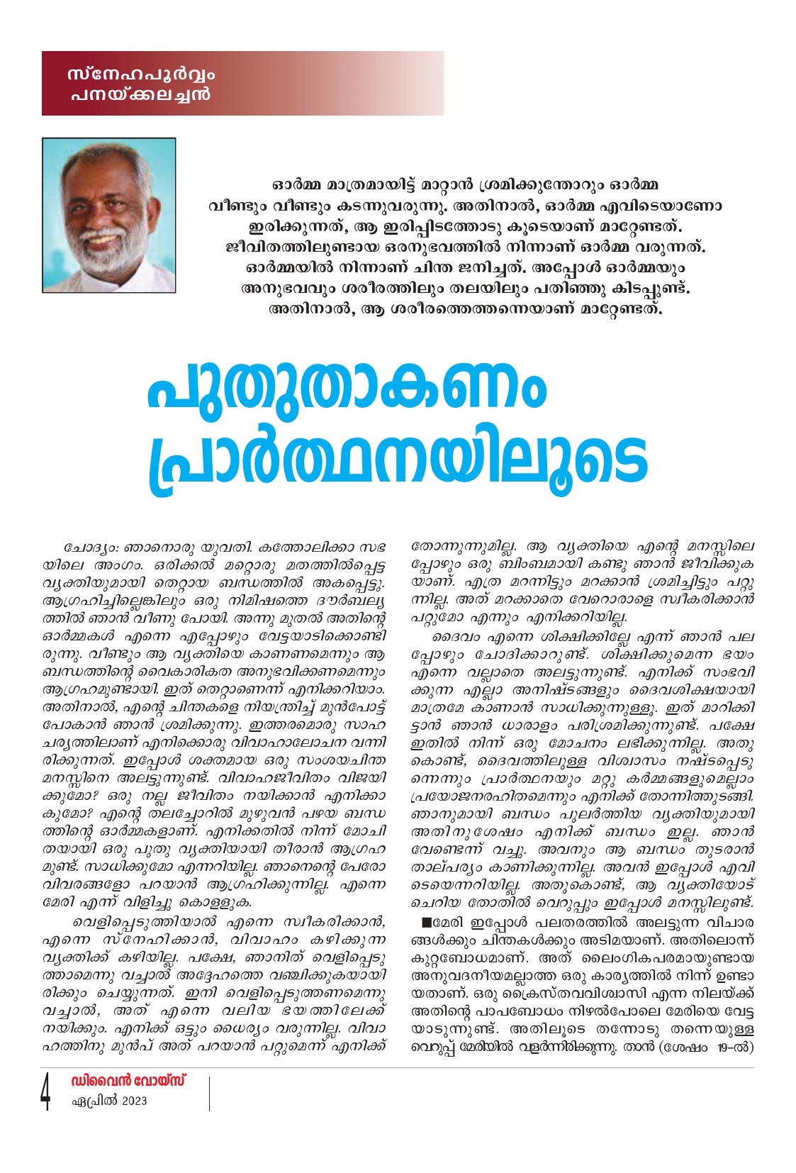 ചോദ്യം: ഞാനൊരു യുവതി കത്തോലിക്കാ സഭ യിലെ അംഗം. ഒരിക്കൽ മറ്റൊരു മതത്തിൽപ്പെട്ട വ്യക്തിയുമായി തെറ്റായ ബന്ധത്തിൽ അകപ്പെട്ടു. ആഗ്രഹിച്ചില്ലെങ്കിലും ഒരു നിമിഷത്തെ ദൗർബല്യ ത്തിൽ ഞാൻ വീണു പോയി അന്നു മുതൽ അതിൻ്റെ ഓർമ്മകൾ എന്നെ എപ്പോഴും വേട്ടയാടിക്കൊണ്ടി രുന്നു. വീണ്ടും ആ വ്യക്തിയെ കാണണമെന്നും ആ ബന്ധത്തിന്റെ വൈകാരികത അനുഭവിക്കണമെന്നും ആഗ്രഹമുണ്ടായി. ഇത് തെറ്റാണെന്ന് എനിക്കറിയാം. അതിനാൽ, എന്റെറെ ചിന്തകളെ നിയന്ത്രിച്ച് മുൻപോട്ട് പോകാൻ ഞാൻ ശ്രമിക്കുന്നു. ഇത്തരമൊരു സാഹ ചര്യത്തിലാണ് എനിക്കൊരു വിവാഹാലോചന വന്നി രിക്കുന്നത്. ഇപ്പോൾ ശക്തമായ ഒരു സംശയചിന്ത മനസ്സിനെ അലട്ടുന്നുണ്ട്. വിവാഹജീവിതം വിജയി ക്കുമോ? ഒരു നല്ല ജീവിതം നയിക്കാൻ എനിക്കാ കുമോ? എന്റെ തലച്ചോറിൽ മുഴുവൻ പഴയ ബന്ധ ത്തിന്റെ ഓർമ്മകളാണ്. എനിക്കതിൽ നിന്ന് മോചി തയായി ഒരു പുതു വ്യക്തിയായി തീരാൻ ആഗ്രഹ മുണ്ട്. സാധിക്കുമോ എന്നറിയില്ല. ഞാനെന്റെ പേരോ വിവരങ്ങളോ പറയാൻ ആഗ്രഹിക്കുന്നില്ല. എന്നെ മേരി എന്ന് വിളിച്ചു കൊള്ളുക.