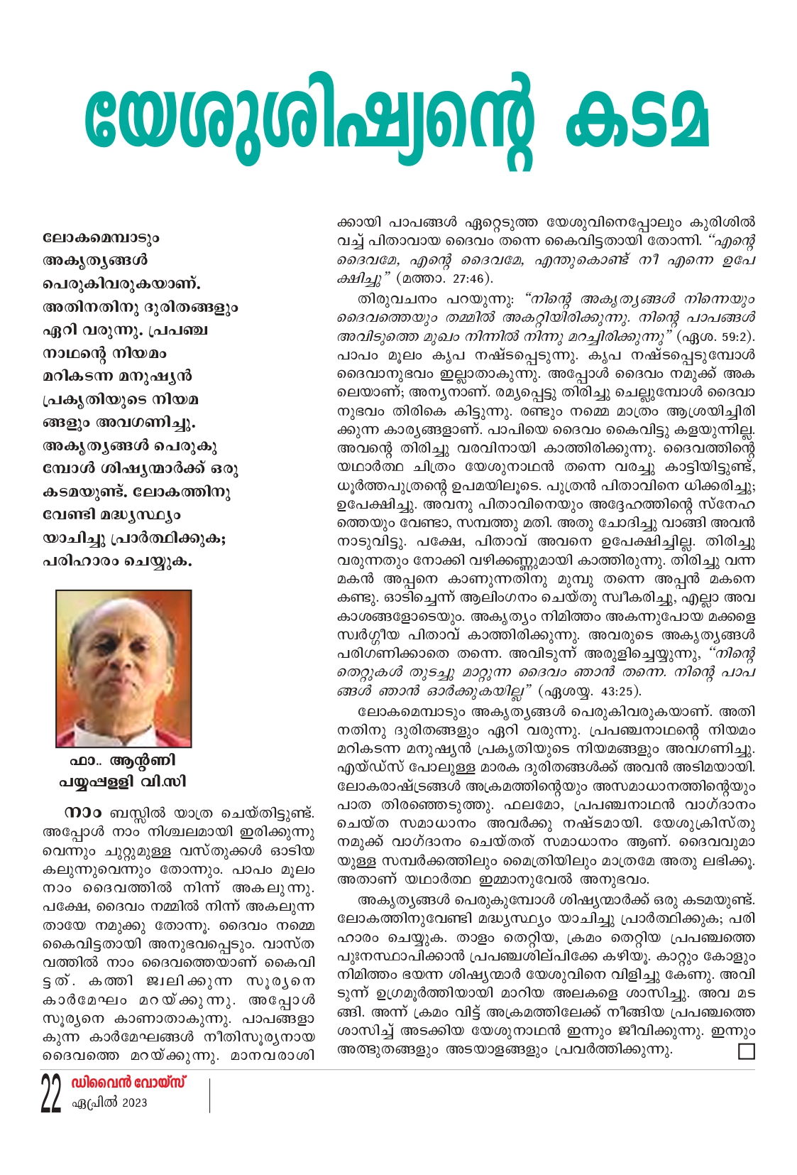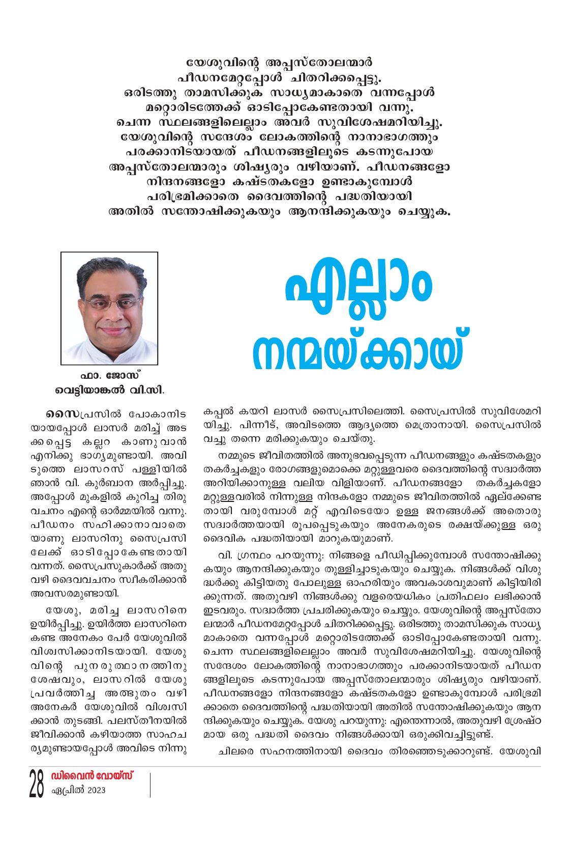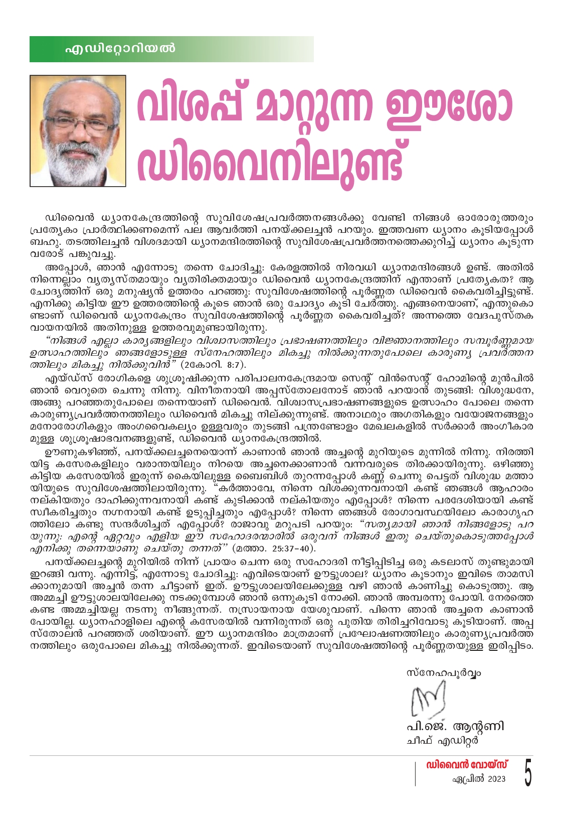 ഡിവൈൻ ധ്യാനകേന്ദ്രത്തിന്റെ സുവിശേഷപ്രവർത്തനങ്ങൾക്കു വേണ്ടി നിങ്ങൾ ഓരോരുത്തരും പ്രത്യേകം പ്രാർത്ഥിക്കണമെന്ന് പല ആവർത്തി പനയ്ക്കലച്ചൻ പറയും ഇത്തവണ ധ്യാനം കൂടിയപ്പോൾ ബഹു. തടത്തിലച്ചൻ വിശദമായി ധ്യാനമന്ദിരത്തിൻ്റെ സുവിശേഷപ്രവർത്തനത്തെക്കുറിച്ച് ധ്യാനം കൂടുന്ന വരോട് പങ്കുവച്ചു. അപ്പോൾ, ഞാൻ എന്നോടു തന്നെ ചോദിച്ചു: കേരളത്തിൽ നിരവധി ധ്യാനമന്ദിരങ്ങൾ ഉണ്ട്. അതിൽ നിന്നെല്ലാം വ്യത്യസ്തമായും വ്യതിരിക്തമായും ഡിവൈൻ ധ്യാനകേന്ദ്രത്തിന് എന്താണ് പ്രത്യേകത? ആ ചോദ്യത്തിന് ഒരു മനുഷ്യൻ ഉത്തരം പറഞ്ഞു: സുവിശേഷത്തിൻ്റെ പൂർണ്ണത ഡിവൈൻ കൈവരിച്ചിട്ടുണ്ട്. എനിക്കു കിട്ടിയ ഈ ഉത്തരത്തിൻ്റെ കൂടെ ഞാൻ ഒരു ചോദ്യം കൂടി ചേർത്തു. എങ്ങനെയാണ്, എന്തുകൊ ണ്ടാണ് ഡിവൈൻ ധ്യാനകേന്ദ്രം സുവിശേഷത്തിൻ്റെ പൂർണ്ണത കൈവരിച്ചത്? അന്നത്തെ വേദപുസ്തക വായനയിൽ അതിനുള്ള ഉത്തരവുമുണ്ടായിരുന്നു. “നിങ്ങൾ എല്ലാ കാര്യങ്ങളിലും വിശ്വാസത്തിലും പ്രഭാഷണത്തിലും വിജ്ഞാനത്തിലും സമ്പൂർണ്ണമായ ഉത്സാഹത്തിലും ഞങ്ങളോടുള്ള സ്നേഹത്തിലും മികച്ചു നിൽക്കുന്നതുപോലെ കാരുണ്യ പ്രവർത്തന ത്തിലും മികച്ചു നിൽക്കുവിൻ" (2കോറി. 8:7). എയ്ഡ്സ് രോഗികളെ ശുശ്രൂഷിക്കുന്ന പരിപാലനകേന്ദ്രമായ സെൻ്റ് വിൻസെൻ്റ് ഹോമിൻ്റെ മുൻപിൽ ഞാൻ വെറുതെ ചെന്നു നിന്നു. വിനീതനായി അപ്പസ്തോലനോട് ഞാൻ പറയാൻ തുടങ്ങി! വിശുദ്ധനേ, അങ്ങു പറഞ്ഞതുപോലെ തന്നെയാണ് ഡിവൈൻ. വിശ്വാസപ്രഭാഷണങ്ങളുടെ ഉത്സാഹം പോലെ തന്നെ കാരുണ്യപ്രവർത്തനത്തിലും ഡിവൈൻ മികച്ചു നില്ക്കുന്നുണ്ട്. അനാഥരും അഗതികളും വയോജനങ്ങളും മനോരോഗികളും അംഗവൈകല്യം ഉള്ളവരും തുടങ്ങി പന്ത്രണ്ടോളം മേഖലകളിൽ സർക്കാർ അംഗീകാര മുള്ള ശുശ്രൂഷാഭവനങ്ങളുണ്ട്. ഡിവൈൻ ധ്യാനകേന്ദ്രത്തിൽ. ഊണുകഴിഞ്ഞ്, പനയ്ക്കലച്ചനെയൊന്ന് കാണാൻ ഞാൻ അച്ചൻ്റെ മുറിയുടെ മുന്നിൽ നിന്നു. നിരത്തി യിട്ട കസേരകളിലും വരാന്തയിലും നിറയെ അച്ചനെക്കാണാൻ വന്നവരുടെ തിരക്കായിരുന്നു. ഒഴിഞ്ഞു കിട്ടിയ കസേരയിൽ ഇരുന്ന് കൈയിലുള്ള ബൈബിൾ തുറന്നപ്പോൾ കണ്ണ് ചെന്നു പെട്ടത് വിശുദ്ധ മത്താ യിയുടെ സുവിശേഷത്തിലായിരുന്നു. "കർത്താവേ, നിന്നെ വിശക്കുന്നവനായി കണ്ട് ഞങ്ങൾ ആഹാരം നല്കിയതും ദാഹിക്കുന്നവനായി കണ്ട് കുടിക്കാൻ നല്കിയതും എപ്പോൾ? നിന്നെ പരദേശിയായി കണ്ട് സ്വീകരിച്ചതും നഗ്നനായി കണ്ട് ഉടുപ്പിച്ചതും എപ്പോൾ? നിന്നെ ഞങ്ങൾ രോഗാവസ്ഥയിലോ കാരാഗൃഹ ത്തിലോ കണ്ടു സന്ദർശിച്ചത് എപ്പോൾ? രാജാവു മറുപടി പറയും: "സത്യമായി ഞാൻ നിങ്ങളോടു പറ യുന്നു: എന്റെ ഏറ്റവും എളിയ ഈ സഹോദരന്മാരിൽ ഒരുവന് നിങ്ങൾ ഇതു ചെയ്തുകൊടുത്തപ്പോൾ എനിക്കു തന്നെയാണു ചെയ്തു തന്നത്" (മത്താ. 25:37-40).