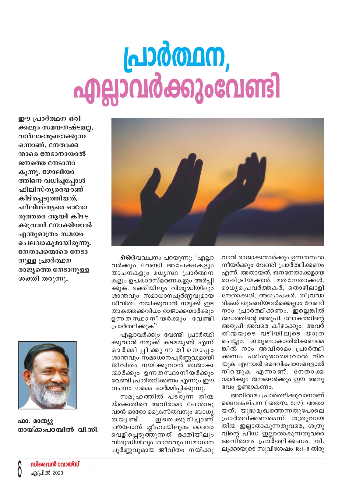 ദൈവവചനം പറയുന്നു: "എല്ലാ വർക്കും വേണ്ടി അപേക്ഷകളും യാചനകളും മധ്യസ്ഥ പ്രാർത്ഥന കളും ഉപകാരസ്മരണകളും അർപ്പി ക്കുക. ഭക്തിയിലും വിശുദ്ധിയിലും ശാന്തവും സമാധാനപൂർണ്ണവുമായ ജീവിതം നയിക്കുവാൻ നമുക്ക് ഇട യാകത്തക്കവിധം രാജാക്കന്മാർക്കും ഉന്നത സ്ഥാനീയർക്കും വേണ്ടി പ്രാർത്ഥിക്കുക" എല്ലാവർക്കും വേണ്ടി പ്രാർത്ഥി ക്കുവാൻ നമുക്ക് കടമയുണ്ട് എന്ന് ഓർമ്മിപ്പിക്കു ന്ന തി നൊപ്പം ശാന്തവും സമാധാനപൂർണ്ണവുമായി ജീവിതം നയിക്കുവാൻ രാജാക്ക ന്മാർക്കും ഉന്നതസ്ഥാനീയർക്കും വേണ്ടി പ്രാർത്ഥിക്കണം എന്നും ഈ വചനം നമ്മെ ഓർമ്മിപ്പിക്കുന്നു