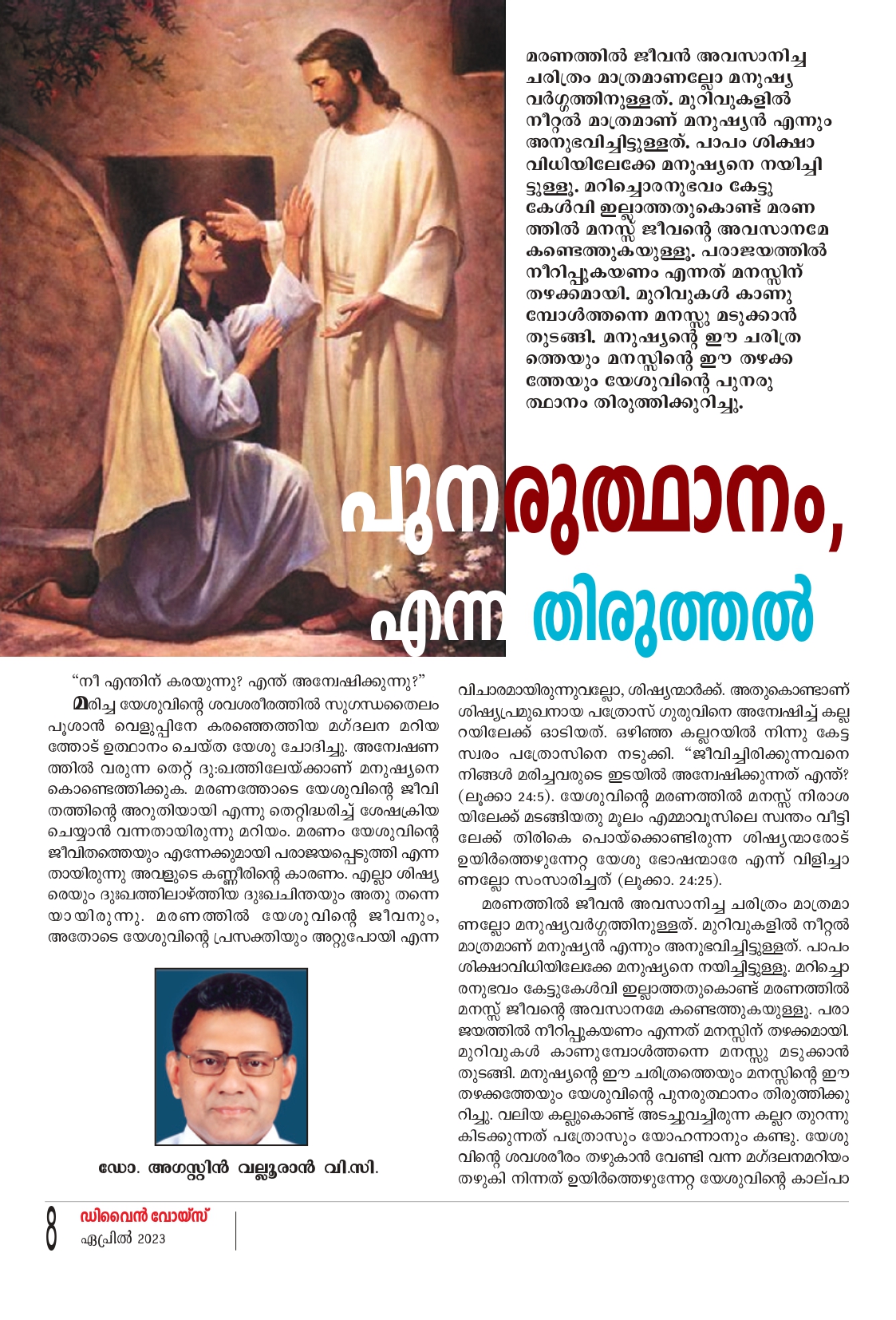 "നീ എന്തിന് കരയുന്നു? എന്ത് അന്വേഷിക്കുന്നു?" മരിച്ച യേശുവിന്റെ ശവശരീരത്തിൽ സുഗന്ധതൈലം പൂശാൻ വെളുപ്പിനേ കരഞ്ഞെത്തിയ മഗ്ദലന മറിയ ത്തോട് ഉത്ഥാനം ചെയ്ത യേശു ചോദിച്ചു. അന്വേഷണ ത്തിൽ വരുന്ന തെറ്റ് ദുഃഖത്തിലേയ്ക്കാണ് മനുഷ്യനെ കൊണ്ടെത്തിക്കുക. മരണത്തോടെ യേശുവിന്റെ ജീവി തത്തിന്റെ അറുതിയായി എന്നു തെറ്റിദ്ധരിച്ച് ശേഷക്രിയ ചെയ്യാൻ വന്നതായിരുന്നു മറിയം. മരണം യേശുവിൻ്റെ ജീവിതത്തെയും എന്നേക്കുമായി പരാജയപ്പെടുത്തി എന്ന തായിരുന്നു അവളുടെ കണ്ണീരിൻ്റെ കാരണം. എല്ലാ ശിഷ്യ രെയും ദുഃഖത്തിലാഴ്ത്തിയ ദുഃഖചിന്തയും അതു തന്നെ യായിരുന്നു. മരണത്തിൽ യേശുവിന്റെ ജീവനും, വിചാരമായിരുന്നുവല്ലോ, ശിഷ്യന്മാർക്ക്. അതുകൊണ്ടാണ് ശിഷ്യപ്രമുഖനായ പത്രോസ് ഗുരുവിനെ അന്വേഷിച്ച് കല്ല റയിലേക്ക് ഓടിയത്. ഒഴിഞ്ഞ കല്ലറയിൽ നിന്നു കേട്ട് സ്വരം പത്രോസിനെ നടുക്കി. "ജീവിച്ചിരിക്കുന്നവനെ നിങ്ങൾ മരിച്ചവരുടെ ഇടയിൽ അന്വേഷിക്കുന്നത് എന്ത്? (ലൂക്കാ 24:5). യേശുവിൻ്റെ മരണത്തിൽ മനസ്സ് നിരാശ യിലേക്ക് മടങ്ങിയതു മൂലം എമ്മാവൂസിലെ സ്വന്തം വീട്ടി ലേക്ക് തിരികെ പൊയ്കൊണ്ടിരുന്ന ശിഷ്യന്മാരോട് ഉയിർത്തെഴുന്നേറ്റ യേശു ഭോഷന്മാരേ എന്ന് വിളിച്ചാ ണല്ലോ സംസാരിച്ചത് (ലൂക്കാ. 24:25). മരണത്തിൽ ജീവൻ അവസാനിച്ച ചരിത്രം മാത്രമാ ണല്ലോ മനുഷ്യവർഗ്ഗത്തിനുള്ളത്.