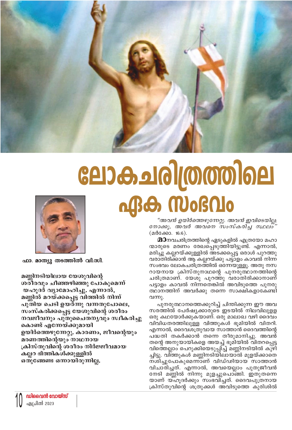 മാനവചരിത്രത്തിൻ്റെ ഏടുകളിൽ എത്രയോ മഹാ ന്മാരുടെ മരണം രേഖപ്പെടുത്തിയിട്ടുണ്ട്. എന്നാൽ, മരിച്ചു കല്ലറയ്ക്കുള്ളിൽ അടക്കപ്പെട്ട ഒരാൾ പുറത്തു വരാതിരിക്കാൻ ആ കല്ലറയ്ക്കു പട്ടാളം കാവൽ നിന്ന സംഭവം ലോകചരിത്രത്തിൽ ഒന്നേയുള്ളൂ. അതു നസ റായനായ ക്രിസ്തുനാഥൻ്റെ പുനരുത്ഥാനത്തിന്റെ ചരിത്രമാണ്. യേശു പുറത്തു വരാതിരിക്കാനാണ്പട്ടാളം കാവൽ നിന്നതെങ്കിൽ അവിടുത്തെ പുനരു ത്ഥാനത്തിന് അവർക്കു തന്നെ സാക്ഷികളാകേണ്ടി വന്നു.പുനരുത്ഥാനത്തെക്കുറിച്ച് ചിന്തിക്കുന്ന ഈ അവ സരത്തിൽ പേർഷ്യക്കാരുടെ ഇടയിൽ നിലവിലുളള ഒരു കഥയോർക്കുകയാണ്. ഒരു മാലാഖ വഴി ദൈവം വിവിധതരത്തിലുള്ള വിത്തുകൾ ഭൂമിയിൽ വിതറി. എന്നാൽ, ദൈവശത്രുവായ സാത്താൻ ദൈവത്തിന്റെ പദ്ധതി തകർക്കാൻ തന്നെ തീരുമാനിച്ചു. അവൻ തന്റെ അനുയായികളെ അയച്ച് ഭൂമിയിൽ വിതറപ്പെട്ട വിത്തെല്ലാം പെറുക്കിയെടുപ്പിച്ച് മണ്ണിനടിയിൽ കുഴി ച്ചിട്ടു. വിത്തുകൾ മണ്ണിനടിയിലായാൽ മുളയ്ക്കാതെ നശിച്ചുപോകുമെന്നാണ് വിഡ്ഢിയായ സാത്താൻ വിചാരിച്ചത്. എന്നാൽ, അവയെല്ലാം പുതുജീവൻ നേടി മണ്ണിൽ നിന്നു മുളച്ചുപൊങ്ങി. ഇതുതന്നെ യാണ് യഹൂദർക്കും സംഭവിച്ചത്.