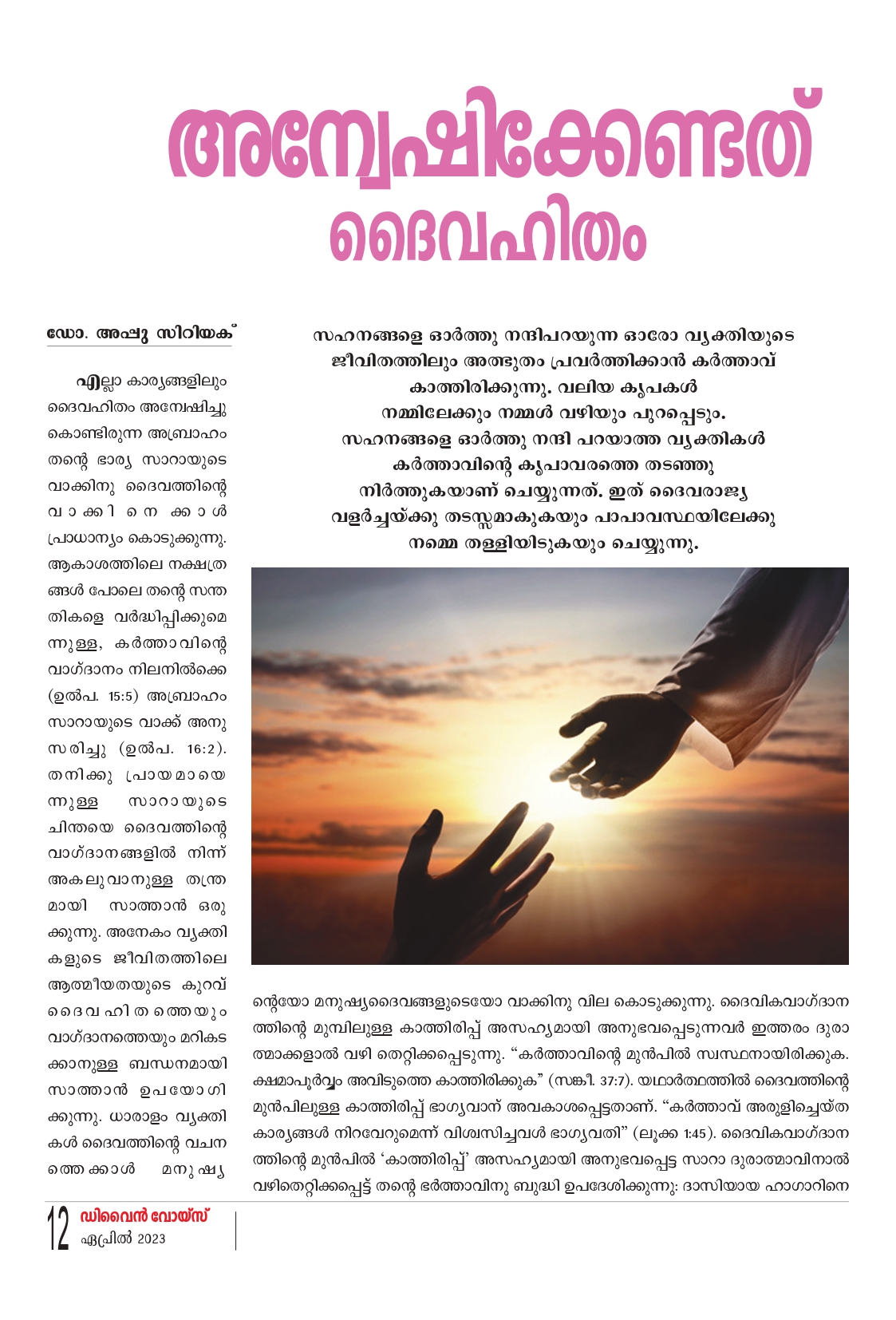 എല്ലാ കാര്യങ്ങളിലും ദൈവഹിതം അന്വേഷിച്ചു കൊണ്ടിരുന്ന അബ്രാഹം തന്റെ ഭാര്യ സാറയുടെ വാക്കിനു ദൈവത്തിന്റെ വാക്കിനെക്കാൾ പ്രാധാന്യം കൊടുക്കുന്നു. ആകാശത്തിലെ നക്ഷത്ര ങ്ങൾ പോലെ തന്റെ സന്ത തികളെ വർദ്ധിപ്പിക്കുമെ ന്നുള്ള, കർത്താവിന്റെ വാഗ്ദാനം നിലനിൽക്കെ (ഉൽപ. 15:5) അബ്രാഹം സാറായുടെ വാക്ക് അനുസരിച്ചു 28. 16:2). തനിക്കു പ്രായമായെന്നുള്ള സാറായുടെ ചിന്തയെ ദൈവത്തിന്റെ വാഗ്ദാനങ്ങളിൽ നിന്ന് അകലുവാനുള്ള തന്ത്ര മായി സാത്താൻ ഒരു ക്കുന്നു. അനേകം വ്യക്തി കളുടെ ജീവിതത്തിലെ ആത്മീയതയുടെ കുറവ് ദൈവ ഹിതത്തെയും വാഗ്ദാനത്തെയും മറികട ക്കാനുള്ള ബന്ധനമായി സാത്താൻ ഉപയോഗി ക്കുന്നു.