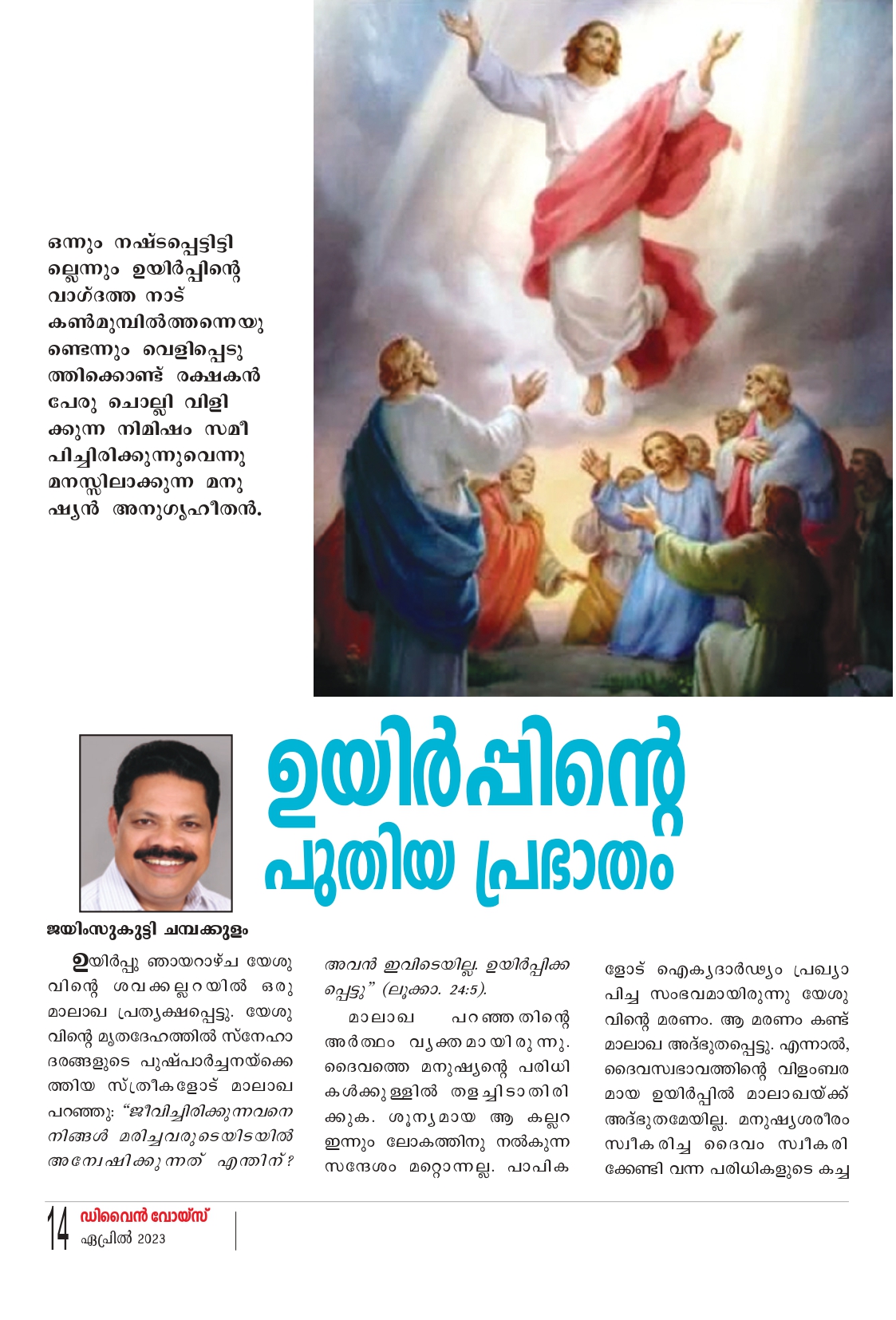 ഉയിർപ്പു ഞായറാഴ്ച യേശു വിൻറെ ശവക്കല്ലറയിൽ ഒരു മാലാഖ പ്രത്യക്ഷപ്പെട്ടു. യേശു വിന്റെ മൃതദേഹത്തിൽ സ്നേഹാ ദരങ്ങളുടെ പുഷ്പാർച്ചനയ്ക്കെ ത്തിയ സ്ത്രീകളോട് മാലാഖ പറഞ്ഞു: “ജീവിച്ചിരിക്കുന്നവനെ നിങ്ങൾ മരിച്ചവരുടെയിടയിൽ അന്വേഷിക്കുന്നത് എന്തിന്? അവൻ ഇവിടെയില്ല. ഉയിർപ്പിക്ക പ്പെട്ടു" (ലൂക്കാ. 24:5). മാലാഖ പറഞ്ഞതിന്റെ അർത്ഥം വ്യക്തമായിരുന്നു. ദൈവത്തെ മനുഷ്യന്റെ പരിധി കൾക്കുള്ളിൽ തളച്ചിടാതിരി ക്കുക. ശൂന്യമായ ആ കല്ലറ ഇന്നും ലോകത്തിനു നൽകുന്ന സന്ദേശം മറ്റൊന്നല്ല. പാപികളോട് ഐക്യദാർഢ്യം പ്രഖ്യാ പിച്ച സംഭവമായിരുന്നു യേശു വിൻ്റെ മരണം. ആ മരണം കണ്ട് മാലാഖ അദ്ഭുതപ്പെട്ടു. എന്നാൽ, ദൈവസ്വഭാവത്തിന്റെ വിളംബര മായ ഉയിർപ്പിൽ മാലാഖയ്ക്ക് അദ്ഭുതമേയില്ല.