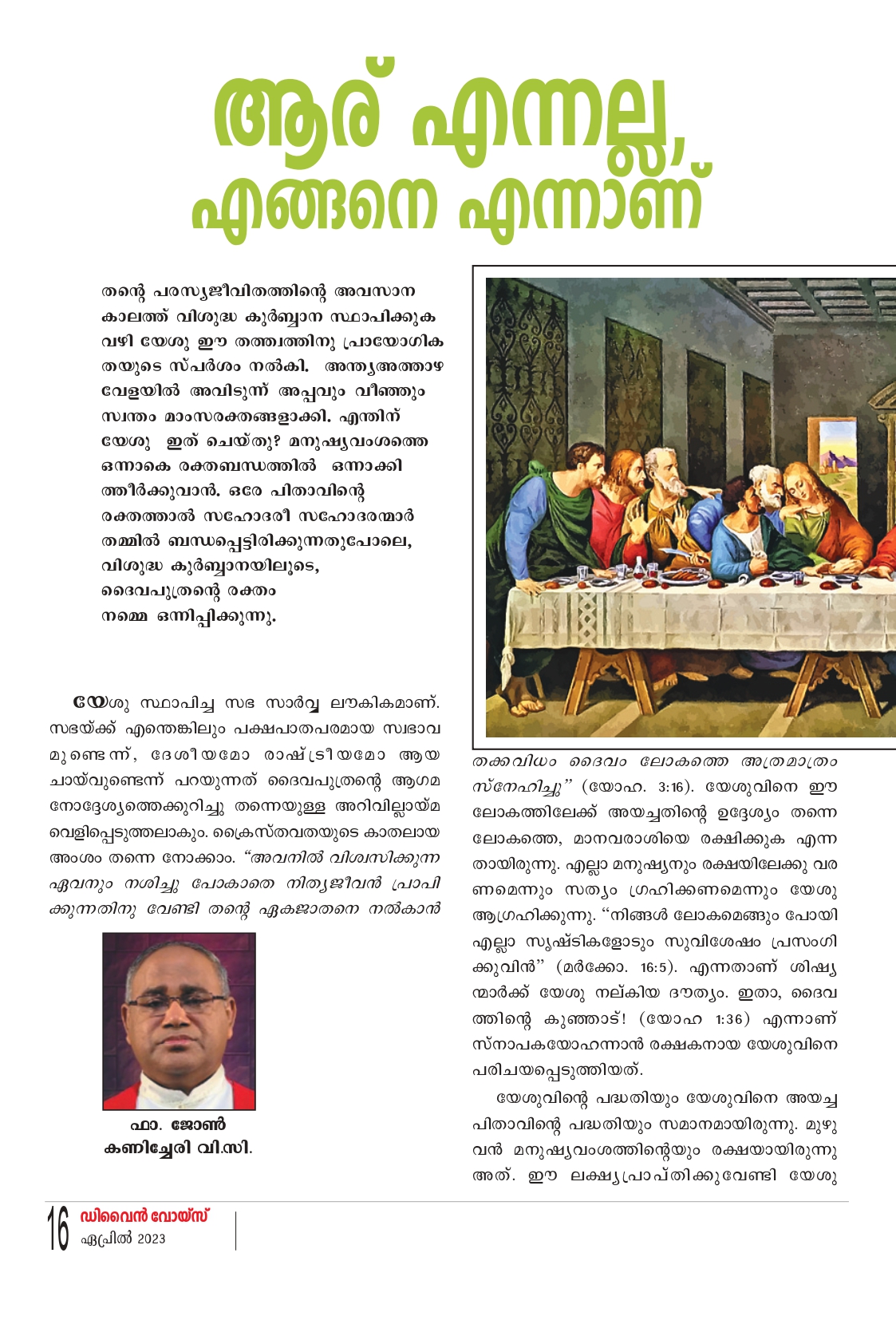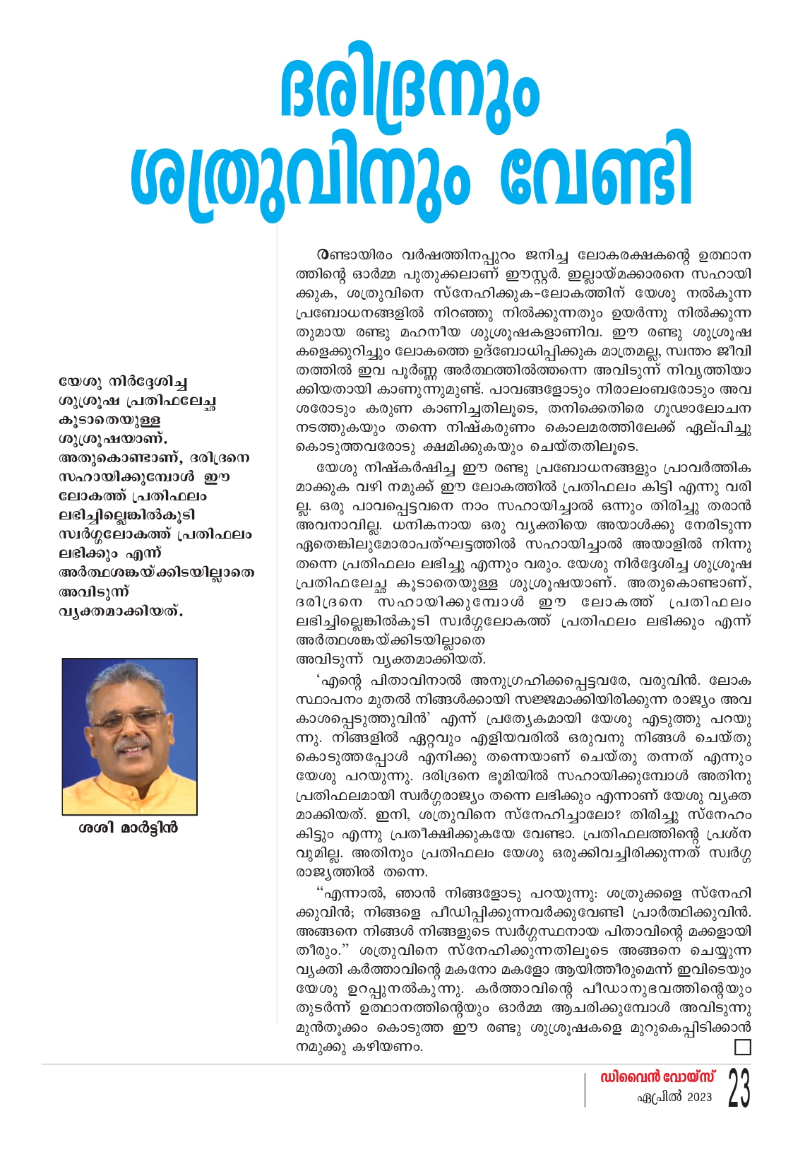 രണ്ടായിരം വർഷത്തിനപ്പുറം ജനിച്ച ലോകരക്ഷകന്റെ ഉത്ഥാന ത്തിന്റെ ഓർമ്മ പുതുക്കലാണ് ഈസ്റ്റർ. ഇല്ലായ്മക്കാരനെ സഹായി ക്കുക. ശത്രുവിനെ സ്നേഹിക്കുക-ലോകത്തിന് യേശു നൽകുന്ന പ്രബോധനങ്ങളിൽ നിറഞ്ഞു നിൽക്കുന്നതും ഉയർന്നു നിൽക്കുന്ന തുമായ രണ്ടു മഹനീയ ശുശ്രൂഷകളാണിവ. ഈ രണ്ടു ശുശ്രൂഷ കളെക്കുറിച്ചും ലോകത്തെ ഉദ്ബോധിപ്പിക്കുക മാത്രമല്ല, സ്വന്തം ജീവി തത്തിൽ ഇവ പൂർണ്ണ അർത്ഥത്തിൽത്തന്നെ അവിടുന്ന് നിവൃത്തിയാ ക്കിയതായി കാണുന്നുമുണ്ട്. പാവങ്ങളോടും നിരാലംബരോടും അവ ശരോടും കരുണ കാണിച്ചതിലൂടെ, തനിക്കെതിരെ ഗൂഢാലോചന നടത്തുകയും തന്നെ നിഷ്കരുണം കൊലമരത്തിലേക്ക് ഏല്പിച്ചു കൊടുത്തവരോടു ക്ഷമിക്കുകയും ചെയ്തതിലൂടെ. യേശു നിഷ്കർഷിച്ച ഈ രണ്ടു പ്രബോധനങ്ങളും പ്രാവർത്തിക മാക്കുക വഴി നമുക്ക് ഈ ലോകത്തിൽ പ്രതിഫലം കിട്ടി എന്നു വരി ല്ല, ഒരു പാവപ്പെട്ടവനെ നാം സഹായിച്ചാൽ ഒന്നും തിരിച്ചു തരാൻ അവനാവില്ല. ധനികനായ ഒരു വ്യക്തിയെ അയാൾക്കു നേരിടുന്ന ഏതെങ്കിലുമോരാപത്ഘട്ടത്തിൽ സഹായിച്ചാൽ അയാളിൽ നിന്നു തന്നെ പ്രതിഫലം ലഭിച്ചു എന്നും വരും. യേശു നിർദ്ദേശിച്ച ശുശ്രൂഷ പ്രതിഫലേച്ഛ കൂടാതെയുള്ള ശുശ്രൂഷയാണ്. അതുകൊണ്ടാണ്. ദരിദ്രനെ സഹായിക്കുമ്പോൾ ഈ ലോകത്ത് പ്രതിഫലം ലഭിച്ചില്ലെങ്കിൽ കൂടി സ്വർഗ്ഗലോകത്ത് പ്രതിഫലം ലഭിക്കും എന്ന് അർത്ഥശങ്കയ്ക്കിടയില്ലാതെ അവിടുന്ന് വ്യക്തമാക്കിയത്.