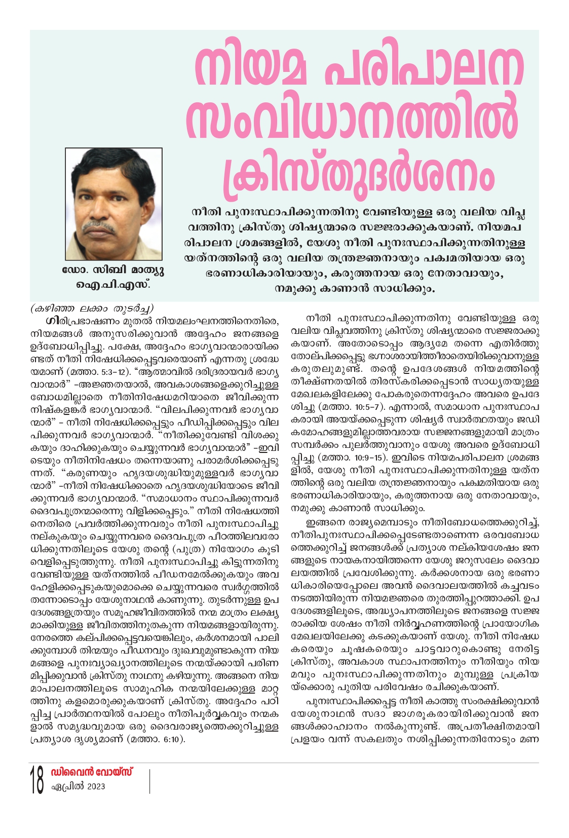 ഗിരിപ്രഭാഷണം മുതൽ നിയമലംഘനത്തിനെതിരെ, നിയമങ്ങൾ അനുസരിക്കുവാൻ അദ്ദേഹം ജനങ്ങളെ ഉദ്ബോധിപ്പിച്ചു. പക്ഷേ, അദ്ദേഹം ഭാഗ്യവാന്മാരായിക്ക ണ്ടത് നീതി നിഷേധിക്കപ്പെട്ടവരെയാണ് എന്നതു ശ്രദ്ധേ യമാണ് (മത്താ. 5:3-12). "ആത്മാവിൽ ദരിദ്രരായവർ ഭാഗ്യ വാന്മാർ" -അജ്ഞതയാൽ, അവകാശങ്ങളെക്കുറിച്ചുള്ള ബോധമില്ലാതെ നീതിനിഷേധമറിയാതെ ജീവിക്കുന്ന നിഷ്കളങ്കർ ഭാഗ്യവാന്മാർ. "വിലപിക്കുന്നവർ ഭാഗ്യവാ ന്മാർ" - നീതി നിഷേധിക്കപ്പെട്ടും പീഡിപ്പിക്കപ്പെട്ടും വില പിക്കുന്നവർ ഭാഗ്യവാന്മാർ. “നീതിക്കുവേണ്ടി വിശക്കു കയും ദാഹിക്കുകയും ചെയ്യുന്നവർ ഭാഗ്യവാന്മാർ” ഇവി ടെയും നീതിനിഷേധം തന്നെയാണു പരാമർശിക്കപ്പെടു ന്നത്. “കരുണയും ഹൃദയശുദ്ധിയുമുള്ളവർ ഭാഗ്യവാ ന്മാർ" -നീതി നിഷേധിക്കാതെ ഹൃദയശുദ്ധിയോടെ ജീവി ക്കുന്നവർ ഭാഗ്യവാന്മാർ. "സമാധാനം സ്ഥാപിക്കുന്നവർ ദൈവപുത്രന്മാരെന്നു വിളിക്കപ്പെടും." നീതി നിഷേധത്തി നെതിരെ പ്രവർത്തിക്കുന്നവരും നീതി പുനഃസ്ഥാപിച്ചു നല്കുകയും ചെയ്യുന്നവരെ ദൈവപുത്ര പീഠത്തിലവരോ ധിക്കുന്നതിലൂടെ യേശു തൻ്റെ (പുത്ര) നിയോഗം കൂടി വെളിപ്പെടുത്തുന്നു. നീതി പുനഃസ്ഥാപിച്ചു കിട്ടുന്നതിനു വേണ്ടിയുള്ള യത്നത്തിൽ പീഡനമേൽക്കുകയും അവ ഹേളിക്കപ്പെടുകയുമൊക്കെ ചെയ്യുന്നവരെ സ്വർഗ്ഗത്തിൽ തന്നോടൊപ്പം യേശുനാഥൻ കാണുന്നു. തുടർന്നുള്ള ഉപ ദേശങ്ങളത്രയും സമൂഹജീവിതത്തിൽ നന്മ മാത്രം ലക്ഷ്യ മാക്കിയുള്ള ജീവിതത്തിനുതകുന്ന നിയമങ്ങളായിരുന്നു. നേരത്തെ കല്പിക്കപ്പെട്ടവയെങ്കിലും, കർശനമായി പാലി ക്കുമ്പോൾ തിന്മയും പീഡനവും ദുഃഖവുമുണ്ടാകുന്ന നിയ മങ്ങളെ പുനഃവ്യാഖ്യാനത്തിലൂടെ നന്മയ്ക്കായി പരിണ മിപ്പിക്കുവാൻ ക്രിസ്തു നാഥനു കഴിയുന്നു. അങ്ങനെ നിയ മാപാലനത്തിലൂടെ സാമൂഹിക നന്മയിലേക്കുള്ള മാറ്റ ത്തിനു കളമൊരുക്കുകയാണ് ക്രിസ്തു. അദ്ദേഹം പഠി പ്പിച്ച പ്രാർത്ഥനയിൽ പോലും നീതിപൂർവ്വകവും നന്മക ളാൽ സമൃദ്ധവുമായ ഒരു ദൈവരാജ്യത്തെക്കുറിച്ചുള്ള പ്രത്യാശ ദൃശ്യമാണ് (മത്താ. 6:10). നീതി പുനഃസ്ഥാപിക്കുന്നതിനു വേണ്ടിയുള്ള ഒരു വലിയ വിപ്ലവത്തിനു ക്രിസ്തു ശിഷ്യന്മാരെ സജ്ജരാക്കു കയാണ്. അതോടൊപ്പം ആദ്യമേ തന്നെ എതിർത്തു തോല്പിക്കപ്പെട്ടു ഭഗ്നാശരായിത്തീരാതെയിരിക്കുവാനുള്ള കരുതലുമുണ്ട്. തൻ്റെ ഉപദേശങ്ങൾ നിയമത്തിന്റെ തീക്ഷ്ണതയിൽ തിരസ്കരിക്കപ്പെടാൻ സാധ്യതയുള്ള മേഖലകളിലേക്കു പോകരുതെന്നദ്ദേഹം അവരെ ഉപദേ ശിച്ചു (മത്താ. 10:5-7). എന്നാൽ, സമാധാന പുനഃസ്ഥാപ കരായി അയയ്ക്കപ്പെടുന്ന ശിഷ്യർ സ്വാർത്ഥതയും ജഡി കമോഹങ്ങളുമില്ലാത്തവരായ സജ്ജനങ്ങളുമായി മാത്രം സമ്പർക്കം പുലർത്തുവാനും യേശു അവരെ ഉദ്ബോധി പ്പിച്ചു (മത്താ 10:9-15) ഇവിടെ നിയമപരിപാലന ശ്രമങ്ങ ളിൽ, യേശു നീതി പുനഃസ്ഥാപിക്കുന്നതിനുള്ള യത