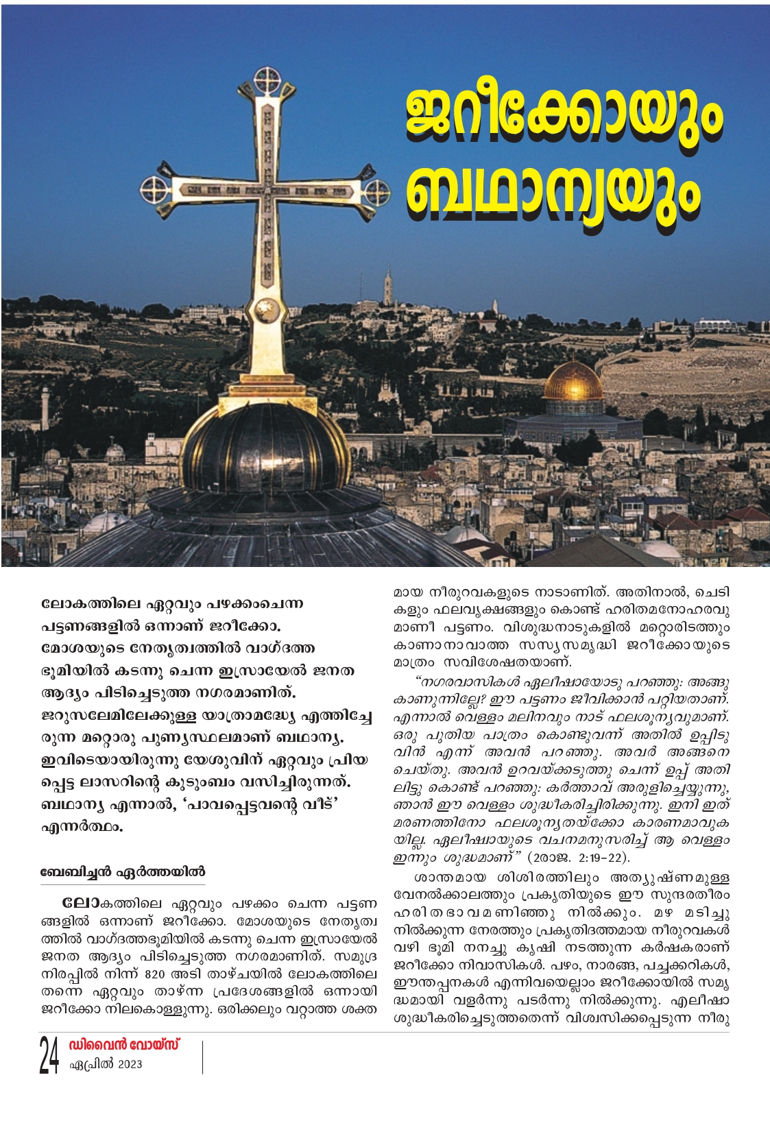 ലോകത്തിലെ ഏറ്റവും പഴക്കം ചെന്ന പട്ടണ ങ്ങളിൽ ഒന്നാണ് ജറീക്കോ. മോശയുടെ നേതൃത്വ ത്തിൽ വാഗ്ദത്തഭൂമിയിൽ കടന്നു ചെന്ന ഇസ്രായേൽ ജനത ആദ്യം പിടിച്ചെടുത്ത നഗരമാണിത്. സമുദ്ര നിരപ്പിൽ നിന്ന് 820 അടി താഴ്ചയിൽ ലോകത്തിലെ തന്നെ ഏറ്റവും താഴ്ന്ന പ്രദേശങ്ങളിൽ ഒന്നായി ജറീക്കോ നിലകൊള്ളുന്നു. ഒരിക്കലും വറ്റാത്ത ശക്തമായ നീരുറവകളുടെ നാടാണിത്. അതിനാൽ, ചെടി കളും ഫലവൃക്ഷങ്ങളും കൊണ്ട് ഹരിതമനോഹരവു മാണീ പട്ടണം. വിശുദ്ധനാടുകളിൽ മറ്റൊരിടത്തും കാണാനാവാത്ത സസ്യസമൃദ്ധി ജറീക്കോയുടെ മാത്രം സവിശേഷതയാണ്. “നഗരവാസികൾ ഏലീഷായോടു പറഞ്ഞു: അങ്ങു കാണുന്നില്ലേ? ഈ പട്ടണം ജീവിക്കാൻ പറ്റിയതാണ്. എന്നാൽ വെള്ളം മലിനവും നാട് ഫലശൂന്യവുമാണ്. ഒരു പുതിയ പാത്രം കൊണ്ടുവന്ന് അതിൽ ഉപ്പിടു വിൻ എന്ന് അവൻ പറഞ്ഞു. അവർ അങ്ങനെ ചെയ്തു. അവൻ ഉറവയ്ക്കടുത്തു ചെന്ന് ഉപ്പ് അതി ലിട്ടു കൊണ്ട് പറഞ്ഞു: കർത്താവ് അരുളിച്ചെയ്യുന്നു. ഞാൻ ഈ വെള്ളം ശുദ്ധീകരിച്ചിരിക്കുന്നു. ഇനി ഇത് മരണത്തിനോ ഫലശൂന്യതയ്ക്കോ കാരണമാവുക യില്ല. ഏലീഷായുടെ വചനമനുസരിച്ച് ആ വെള്ളം ഇന്നും ശുദ്ധമാണ്" (2രാജ. 2:19-22