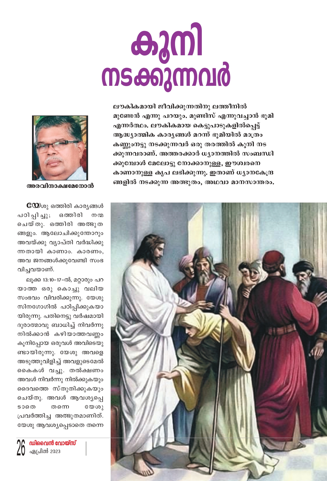 യേശു ഒത്തിരി കാര്യങ്ങൾ പഠിപ്പിച്ചു; ഒത്തിരി (1)(2) ചെയ്തു. ഒത്തിരി അത്ഭുത ങ്ങളും. ആലോചിക്കുന്തോറും അവയ്ക്കു വ്യാപ്തി വർദ്ധിക്കു ന്നതായി കാണാം. കാരണം. അവ ജനങ്ങൾക്കുവേണ്ടി സംഭ വിച്ചവയാണ്. ലൂക്ക 13:10-17-ൽ, മറ്റാരും പറ യാത്ത ഒരു കൊച്ചു വലിയ സംഭവം വിവരിക്കുന്നു. യേശു സിനഗോഗിൽ പഠിപ്പിക്കുകയാ യിരുന്നു. പതിനെട്ടു വർഷമായി ദുരാത്മാവു ബാധിച്ച് നിവർന്നു നിൽക്കാൻ കഴിയാത്തവണ്ണം കൂനിപ്പോയ ഒരുവൾ അവിടെയു ണ്ടായിരുന്നു. യേശു അവളെ അടുത്തുവിളിച്ച് അവളുടെമേൽ കൈകൾ വച്ചു. തൽക്ഷണം അവൾ നിവർന്നു നിൽക്കുകയും ദൈവത്തെ സ്തുതിക്കുകയും ചെയ്തു. അവൾ ആവശ്യപ്പെ ()() യേശു പ്രവർത്തിച്ച അത്ഭുതമാണിത്.