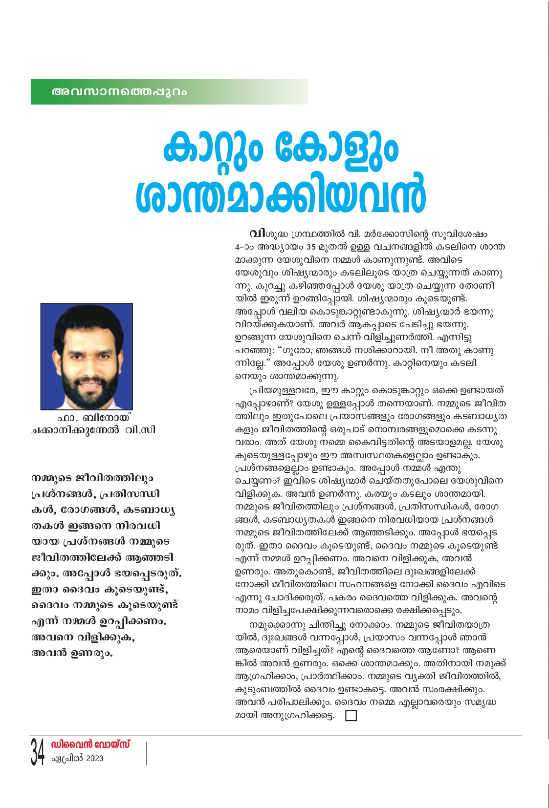 വിശുദ്ധ ഗ്രന്ഥത്തിൽ വി. മർക്കോസിൻ്റെ സുവിശേഷം 4-ാം അദ്ധ്യായം 35 മുതൽ ഉള്ള വചനങ്ങളിൽ കടലിനെ ശാന്ത മാക്കുന്ന യേശുവിനെ നമ്മൾ കാണുന്നുണ്ട്. അവിടെ യേശുവും ശിഷ്യന്മാരും കടലിലൂടെ യാത്ര ചെയ്യുന്നത് കാണു ന്നു. കുറച്ചു കഴിഞ്ഞപ്പോൾ യേശു യാത്ര ചെയ്യുന്ന തോണി യിൽ ഇരുന്ന് ഉറങ്ങിപ്പോയി. ശിഷ്യന്മാരും കൂടെയുണ്ട്. അപ്പോൾ വലിയ കൊടുങ്കാറ്റുണ്ടാകുന്നു. ശിഷ്യന്മാർ ഭയന്നു വിറയ്ക്കുകയാണ്. അവർ ആകപ്പാടെ പേടിച്ചു ഭയന്നു. ഉറങ്ങുന്ന യേശുവിനെ ചെന്ന് വിളിച്ചുണർത്തി. എന്നിട്ടു പറഞ്ഞു: "ഗുരോ, ഞങ്ങൾ നശിക്കാറായി. നീ അതു കാണു ന്നില്ലേ." അപ്പോൾ യേശു ഉണർന്നു. കാറ്റിനെയും കടലി നെയും ശാന്തമാക്കുന്നു.