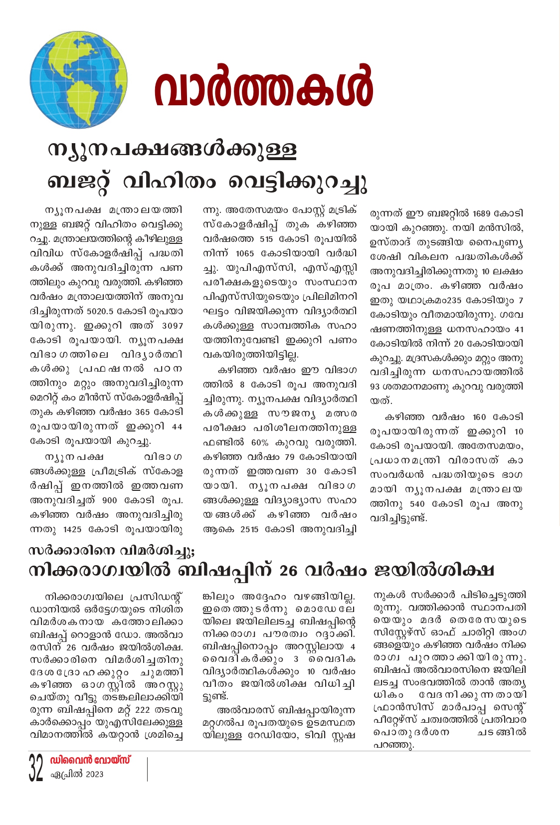 ന്യൂനപക്ഷങ്ങൾക്കുള്ള ബജറ്റ് വിഹിതം വെട്ടിക്കുറച്ചു ന്യൂനപക്ഷ മന്ത്രാലയത്തി നുള്ള ബജറ്റ് വിഹിതം വെട്ടിക്കു റച്ചു. മന്ത്രാലയത്തിന്റെ കീഴിലുള്ള വിവിധ സ്കോളർഷിപ്പ് പദ്ധതി കൾക്ക് അനുവദിച്ചിരുന്ന പണ ത്തിലും കുറവു വരുത്തി. കഴിഞ്ഞ വർഷം മന്ത്രാലയത്തിന് അനുവ ദിച്ചിരുന്നത് 5020.5 കോടി രൂപയാ യിരുന്നു. ഇക്കുറി അത് 3097 കോടി രൂപയായി. ന്യൂനപക്ഷ വിഭാ ഗത്തിലെ വിദ്യാർത്ഥി കൾക്കു പ്രഫഷനൽ പഠന ത്തിനും മറ്റും അനുവദിച്ചിരുന്ന മെറിറ്റ് കം മീൻസ് സ്കോളർഷിപ്പ് തുക കഴിഞ്ഞ വർഷം 365 കോടി രൂപയായിരുന്നത് ഇക്കുറി 44 കോടി രൂപയായി കുറച്ചു.