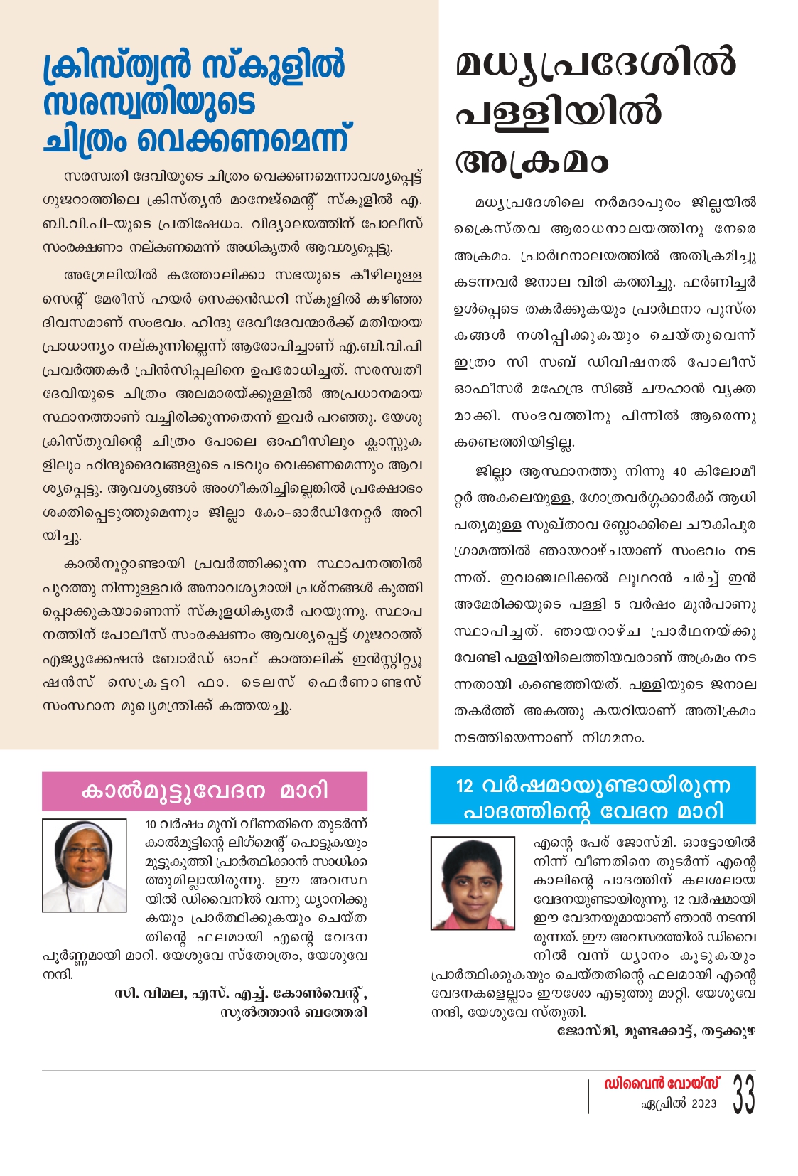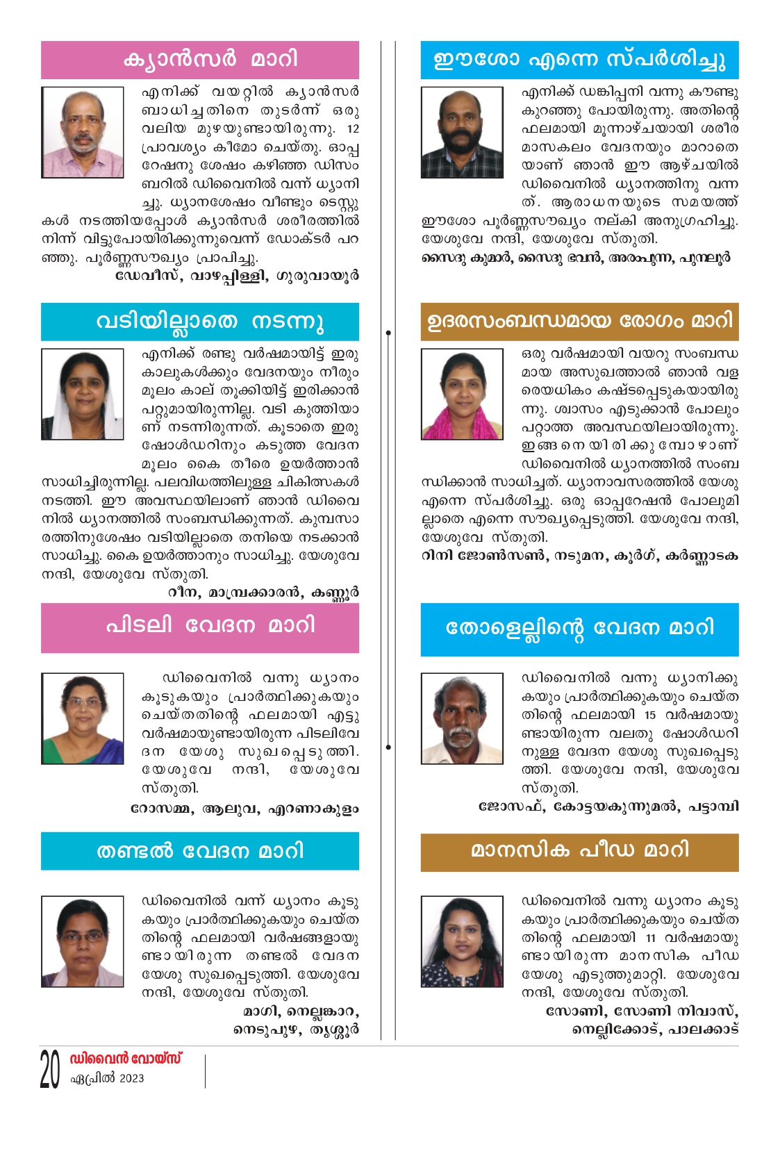ക്യാൻസർ മാറി എനിക്ക് വയറ്റിൽ ക്യാൻസർ ബാധിച്ചതിനെ തുടർന്ന് ഒരു വലിയ മുഴയുണ്ടായിരുന്നു. 12 പ്രാവശ്യം കീമോ ചെയ്തു. ഓപ്പ റേഷനു ശേഷം കഴിഞ്ഞ ഡിസം ബറിൽ ഡിവൈനിൽ വന്ന് ധ്യാനി ച്ചു. ധ്യാനശേഷം വീണ്ടും ടെസ്റ്റു കൾ നടത്തിയപ്പോൾ ക്യാൻസർ ശരീരത്തിൽ നിന്ന് വിട്ടുപോയിരിക്കുന്നുവെന്ന് ഡോക്ടർ പറ ഞ്ഞു. പൂർണ്ണസൗഖ്യം പ്രാപിച്ചു. ഡേവീസ്, വാഴപ്പിള്ളി, ഗുരുവായൂർ